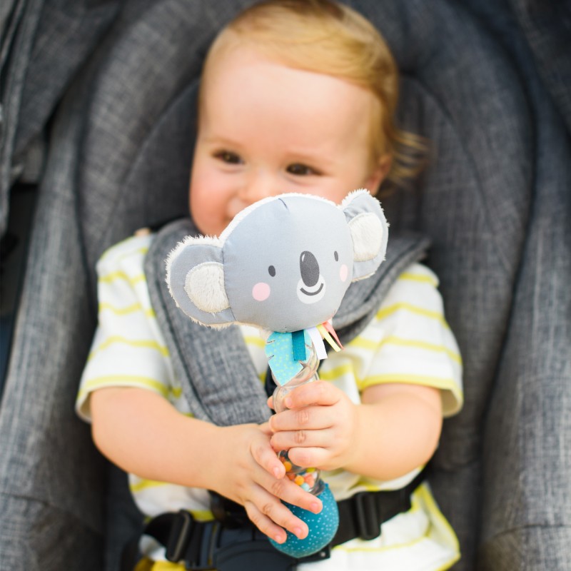 Un bâton de pluie sous forme d’un koala. Lorsque l’enfant retourne le koala, les petites billes vont descendre dans le bâton de pluie ! La tête du koala et l’embout du bâton sont en tissu pour éviter que l’enfant se fasse mal.