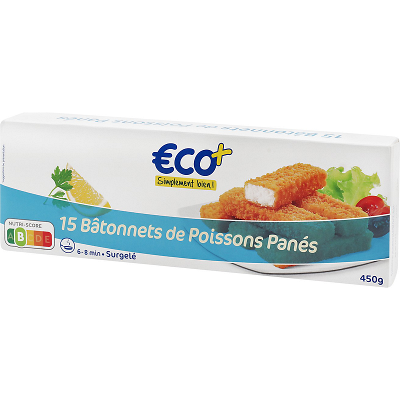 Bâtonnets de chair hachée de poissons*, panés, préfrits, surgelés ECO +