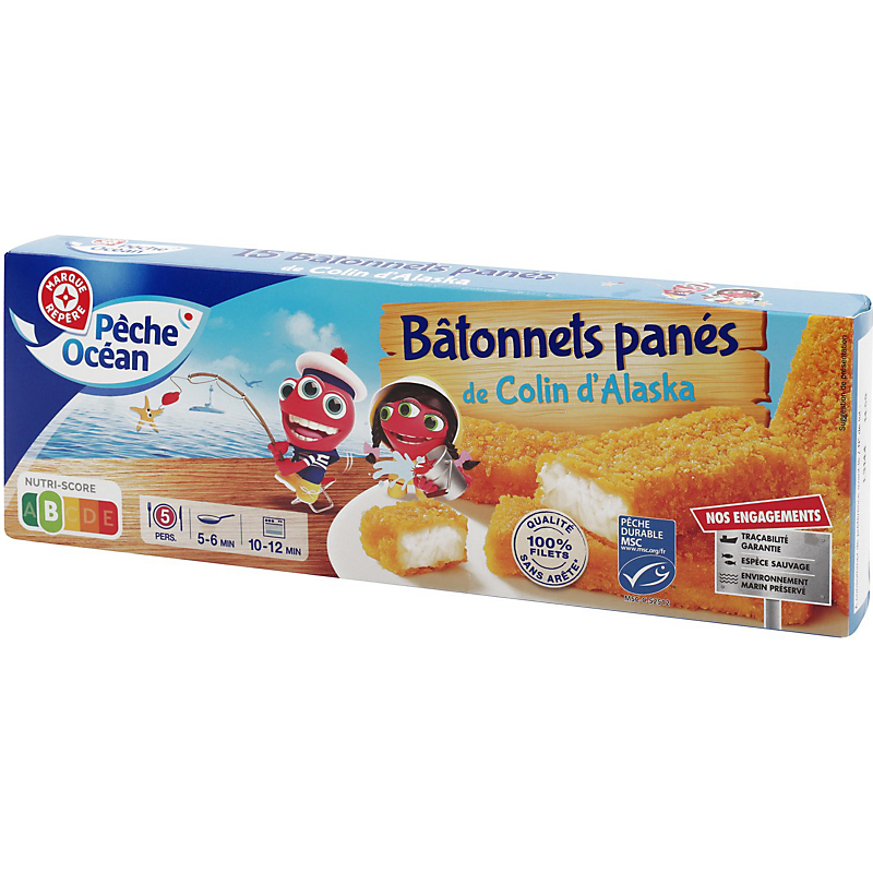 Bâtonnets de filets de colin d'Alaska*, panés, préfrits, surgelés * Qualité sans arrête : bien qu'un soin tout particulier ait été pris pour éliminer toutes les arêtes, quelques-unes peuvent exceptionnellement se retrouver dans ce produit. PECHE OCEAN