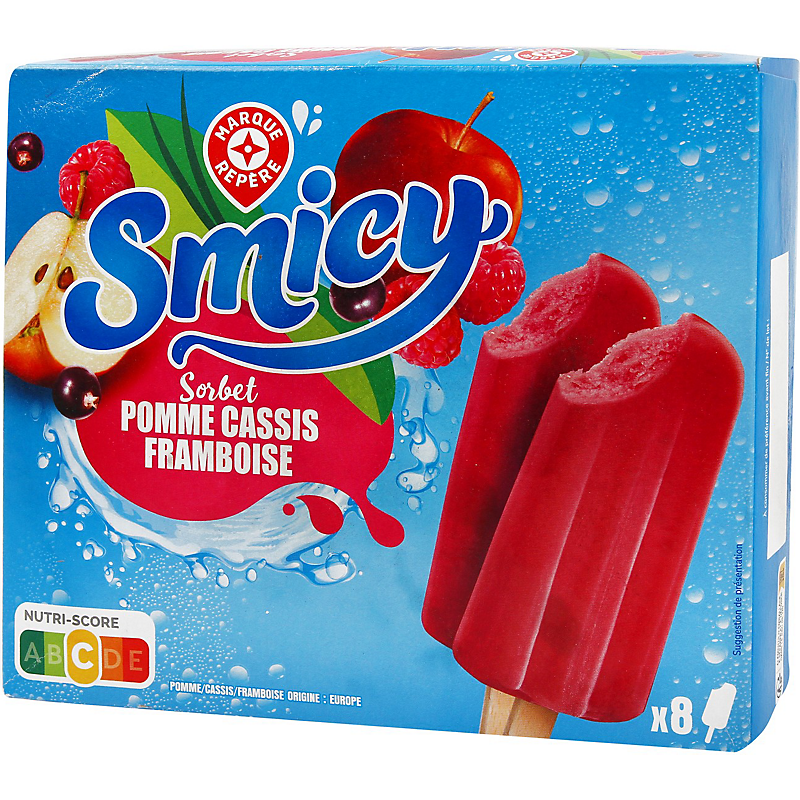 Bâtonnets de sorbet à la pomme et aux fruits rouges (framboise et cassis), aromatisé. SMICY