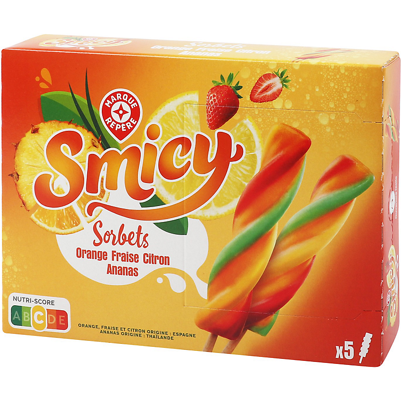 Bâtonnets de glace à l'eau à l'orange 64 %, glace à l'eau à la fraise 12 %, glace à l'eau à l'ananas 12 % et glace à l'eau au citron 12 % SMICY