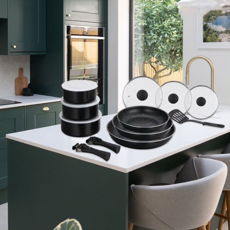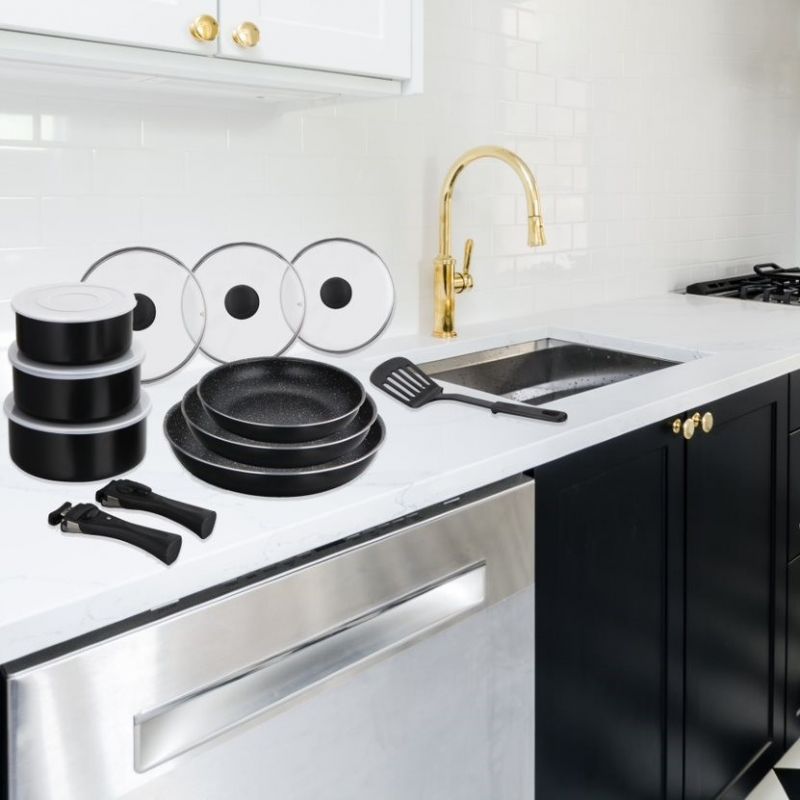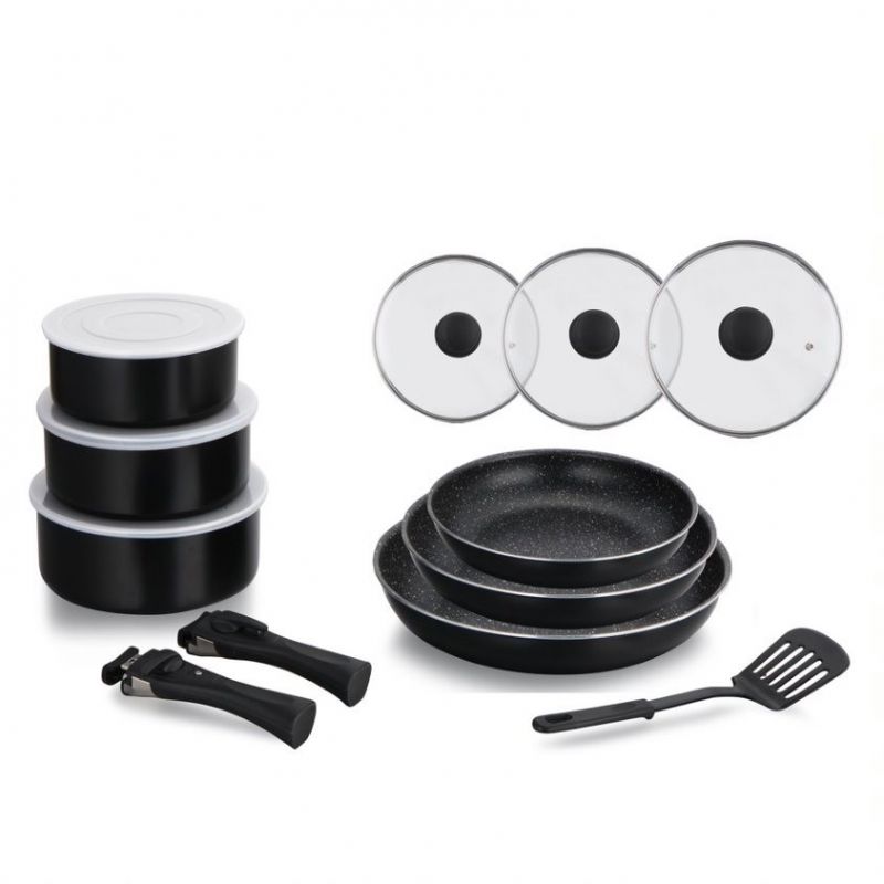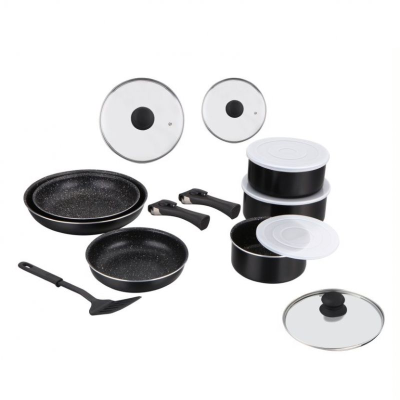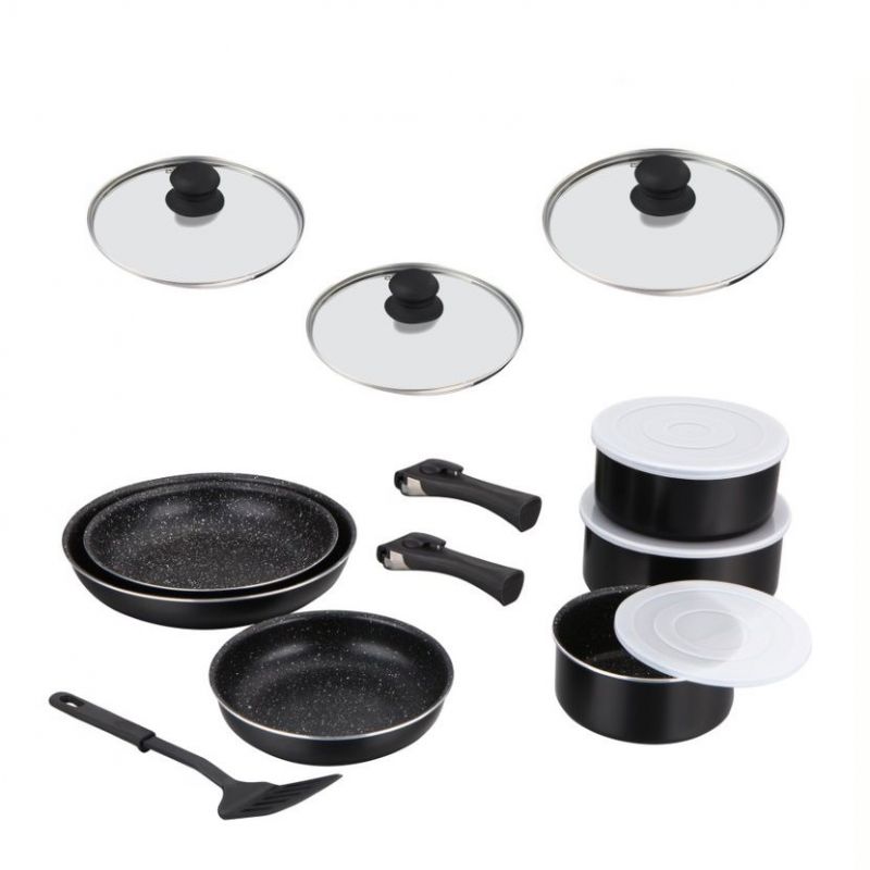 Libellé Batterie de cuisine revêtement pierre avec manche amovible 15 pièces noir Herzberg HG8091-15-BK