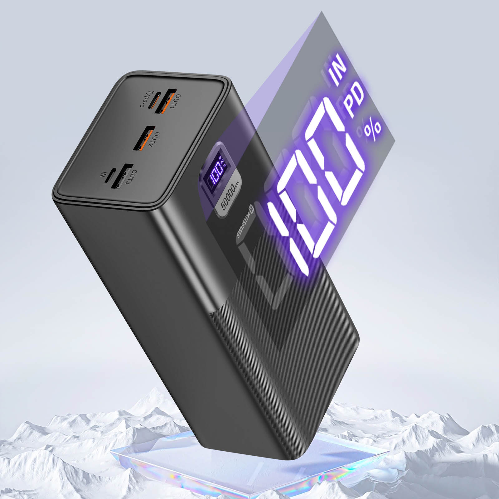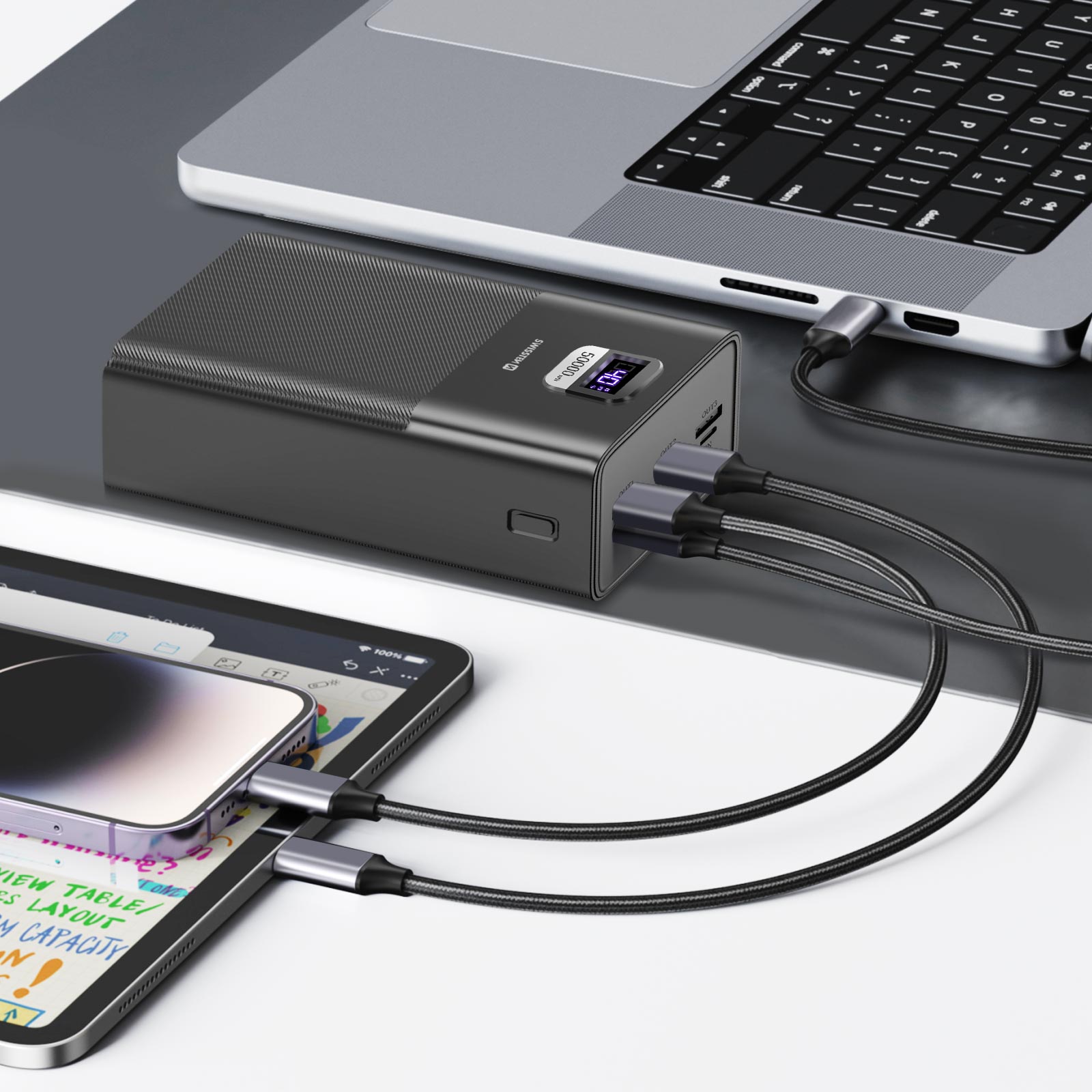 Chargeur de secours, marque Swissten avec une capacité de 50000mAh. Sorties USB 100W assurant une recharge rapide. Voyant LED pour d'identifier le niveau de charge du powerbank. 3 sorties USB, un entrée/sortie USB-C et un entrée microUSB. Ininflammable.
