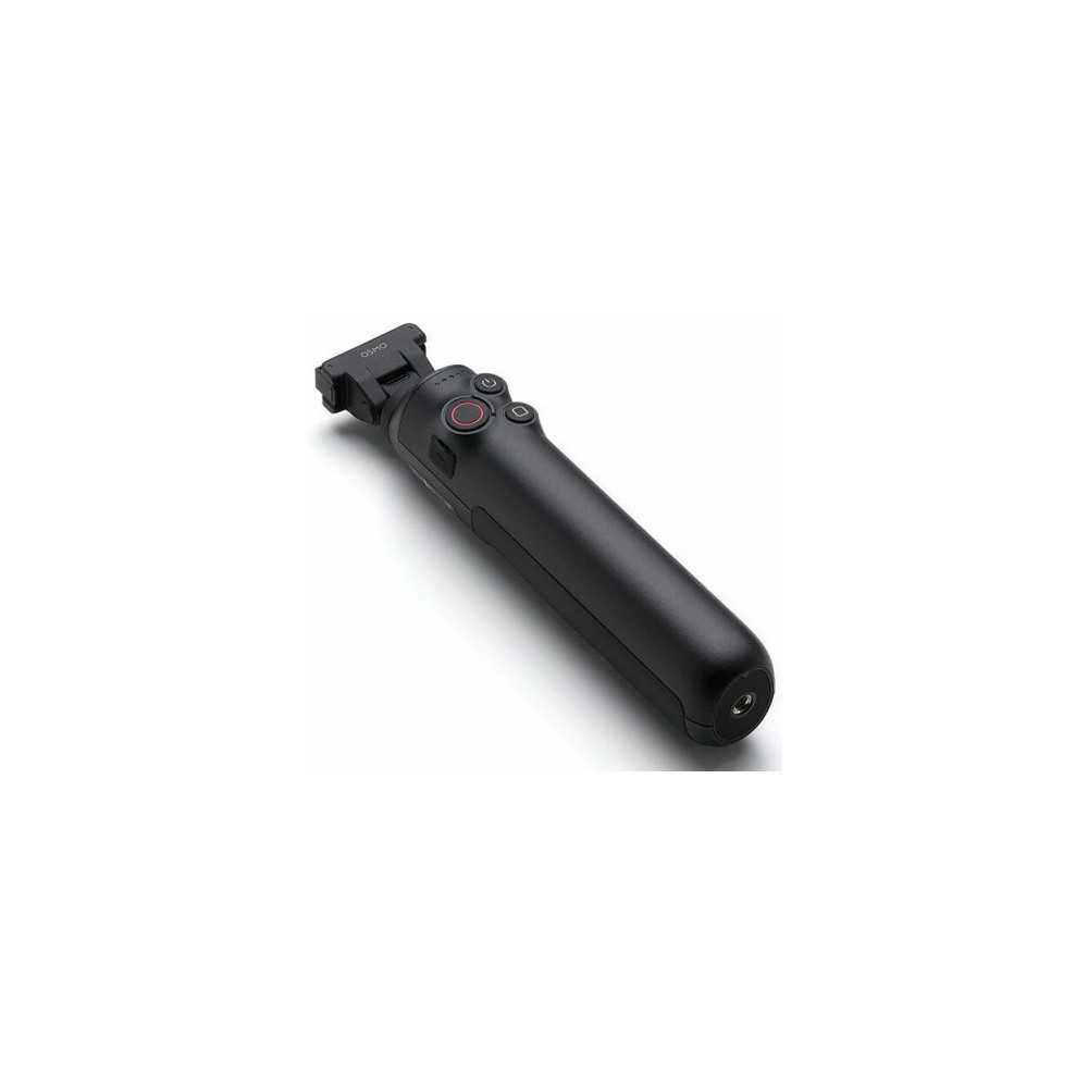 Deux modes de position via système de réglage (perche invisible / selfie frontal), montage inférieur fileté compatible trépied et compatibilité dédiée Osmo 360.