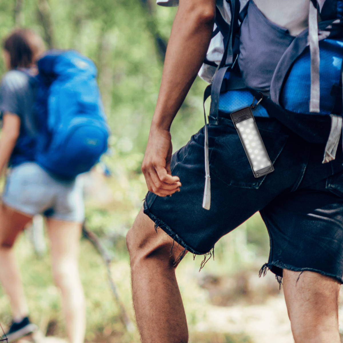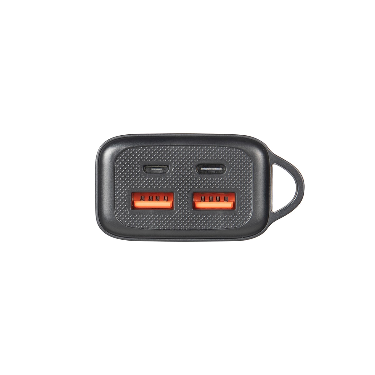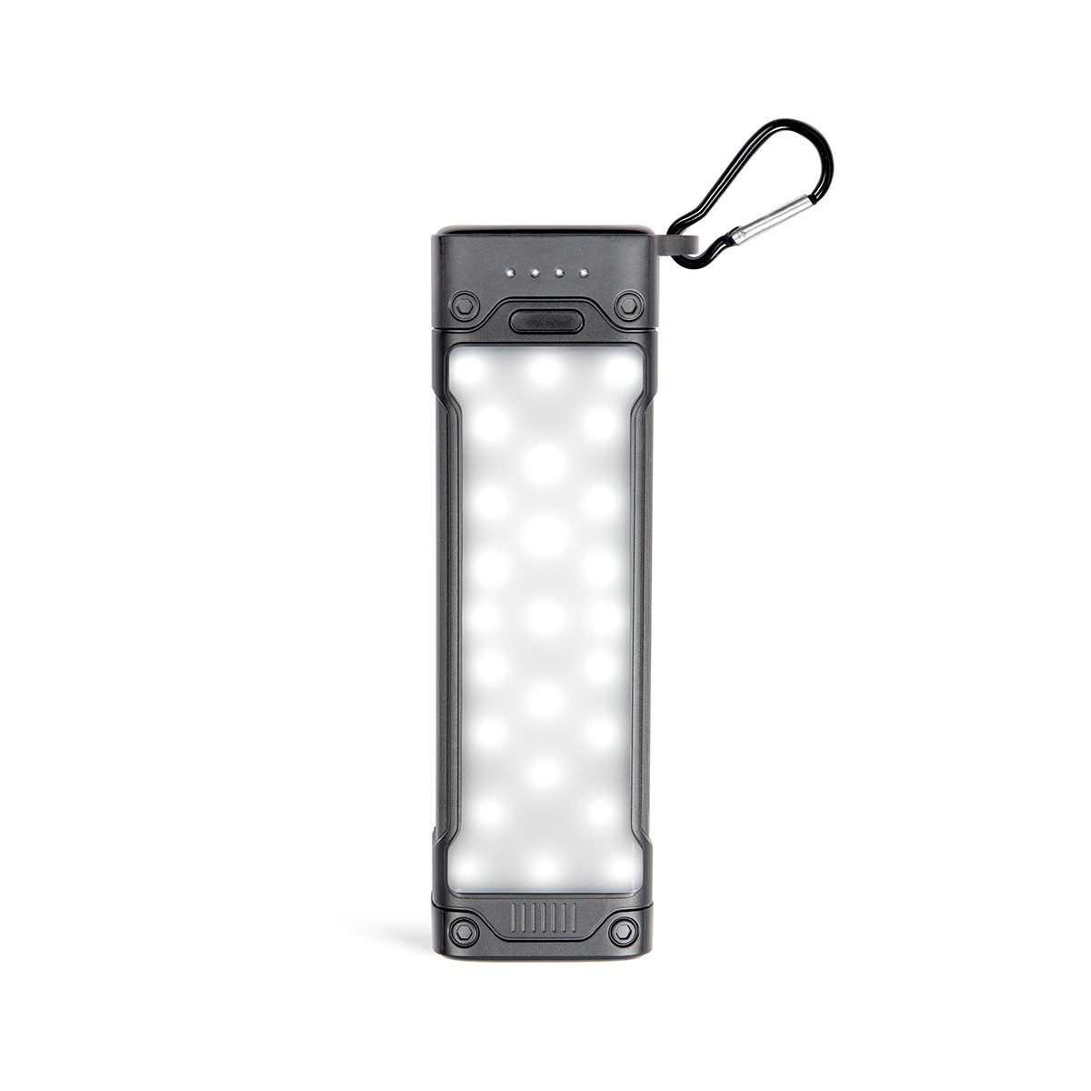 Grande capacité 20 000 mAh. Permet de charger 3 appareils en simultané. Fast charge puissance max 20 W. Torche 25 LED avec 3 intensités lumineuse et un mode SOS. 1 port de chargement USB Type-C et 2 ports de chargements USB. Indicateur de capacité restante par LED. Accessoires inclus : 1 mousqueton + 1 sangle. Charge de l'appareil via câble USB/Type-C inclus ou USB/micro-USB