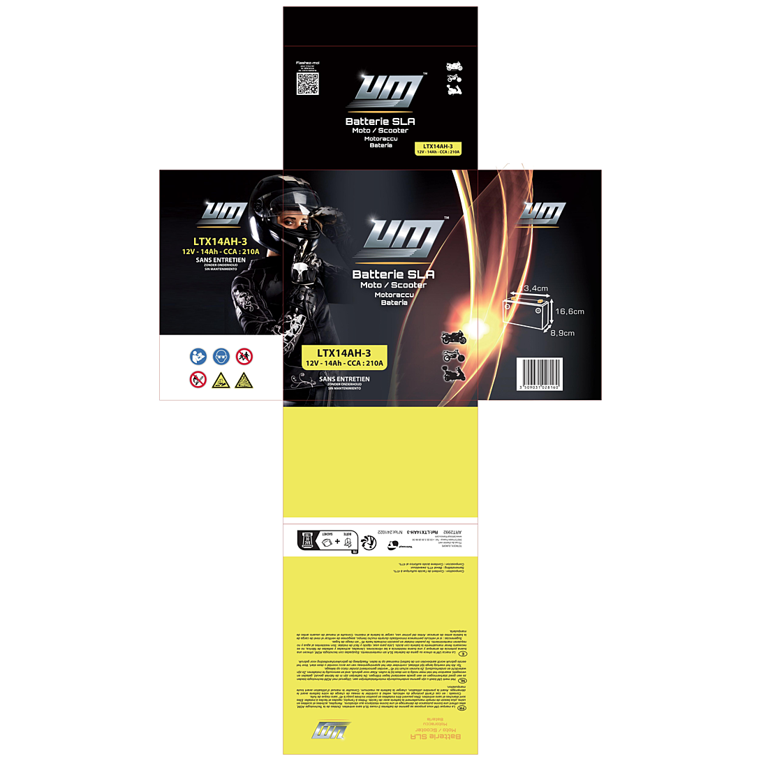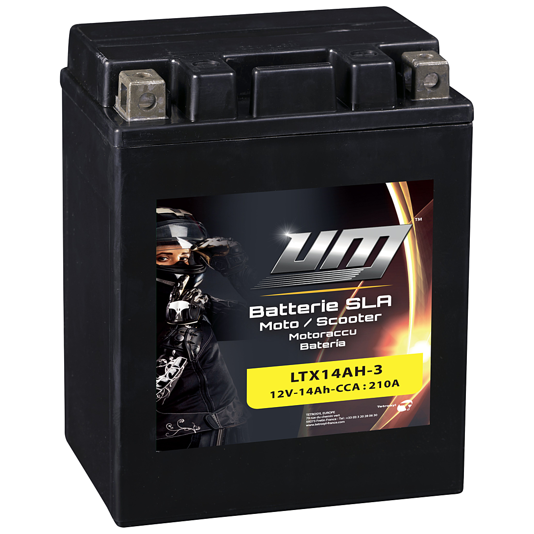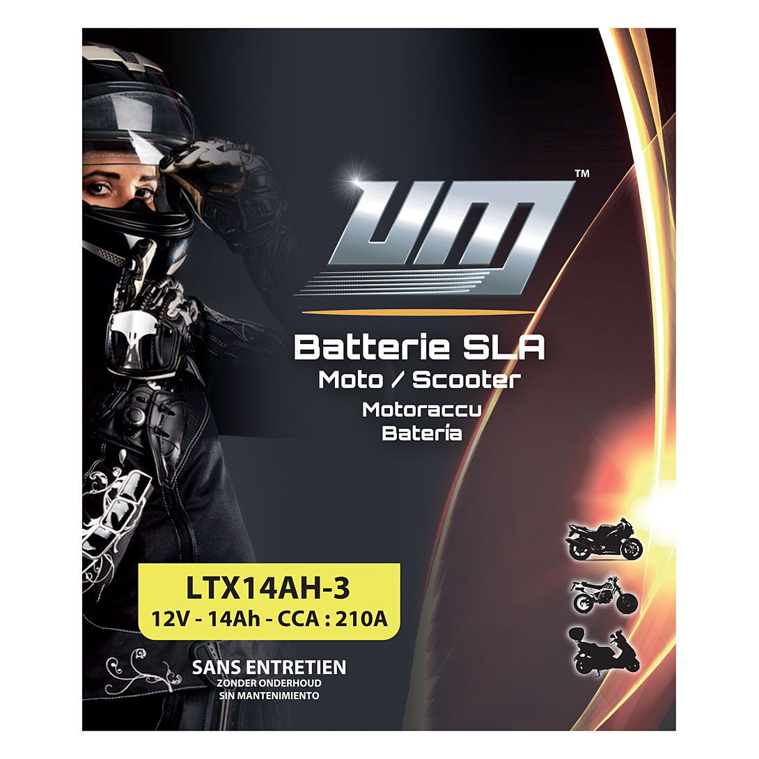 La marque UM vous propose sa gamme de batteries 2-roues SLA sans entretien. Dotées de la Technologie AGM, elles offrent une bonne puissance de démarrage et une bonne résistance aux vibrations. Remplies, activées et scellées en usine, plus besoin de remplir manuellement la batterie avec de l’acide. Prêtes à l’emploi, rapides et faciles à installer. Elles sont étanches et sans entretien. Elles peuvent être installées en position inclinée jusqu’à 45° sans risque de fuite.