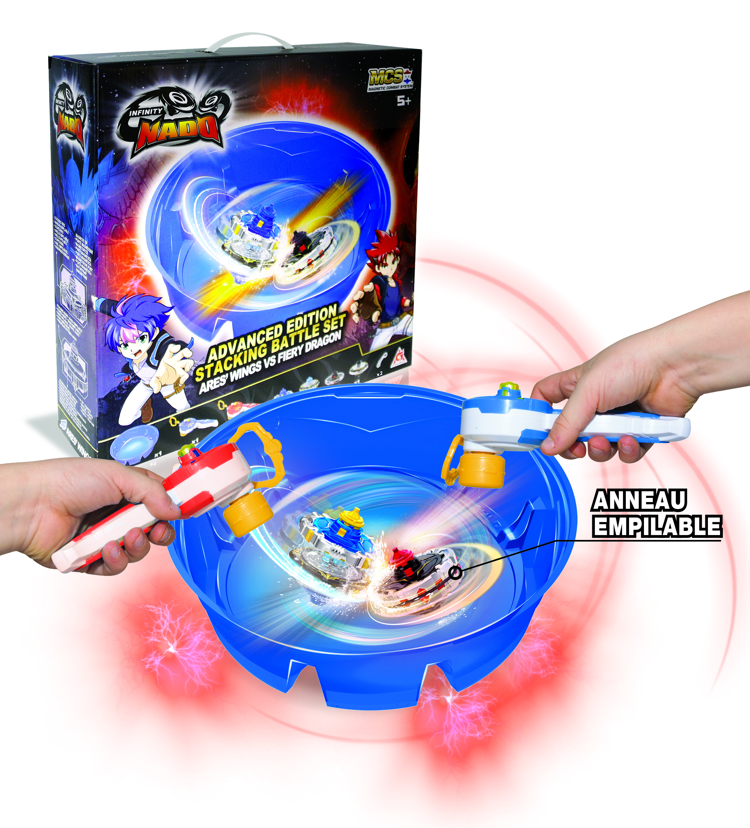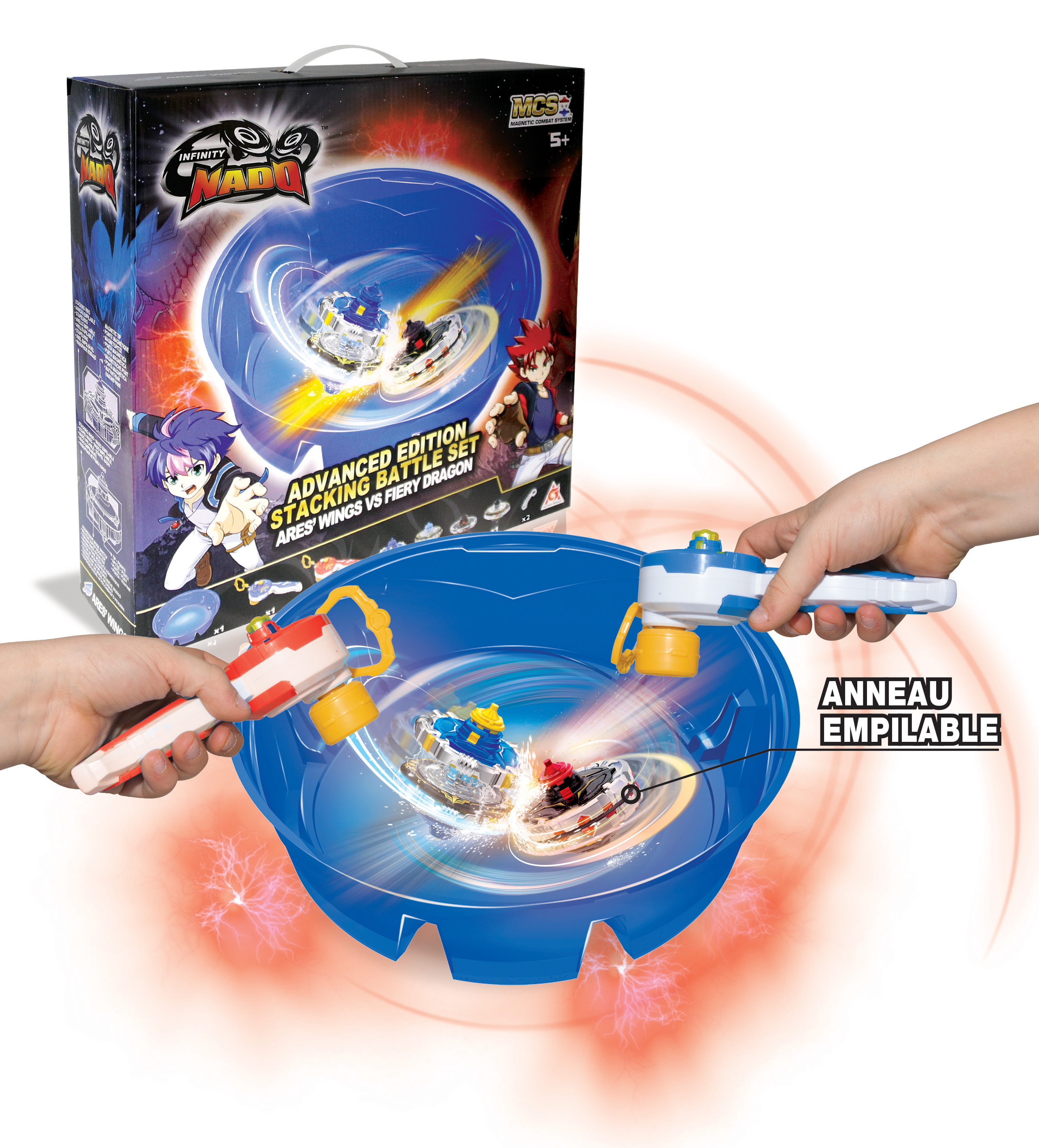 Ce BATTLE SET Infinity Nado comprend tout le nécessaire pour découvrir les toupies Infinity Nado empilables et affronter tes amis dans larène, dans des combats acharnés ! Le BATTLE SET Infinity Nado est composé : d'une arène de combat pour des affrontements impressionnants, 2 toupies empilables Ares Wings et Fiery Dragon avec leurs anneaux empilables en métal, 2 lanceurs magnétiques pour lancer les toupies dans l'arène à pleine puissance, et 1 outil dassemblage pour changer la configuration des toupies et ajuster sa tactique de jeu.