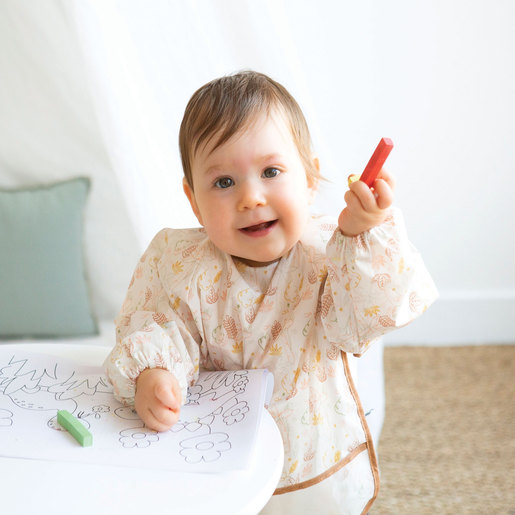 Ce bavoir couvre intégralement les affaires de votre enfant grâce à sa forme tablier. Il est en plastique (100% polyester) ultra souple, doux et imperméable. Il est parfait pour les repas seuls ou pour les activités. Il s'attache avec des lacets au dos.