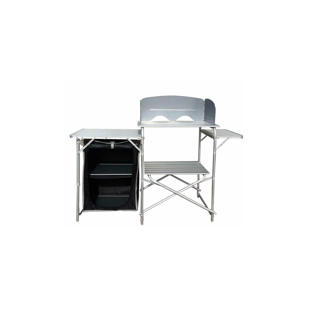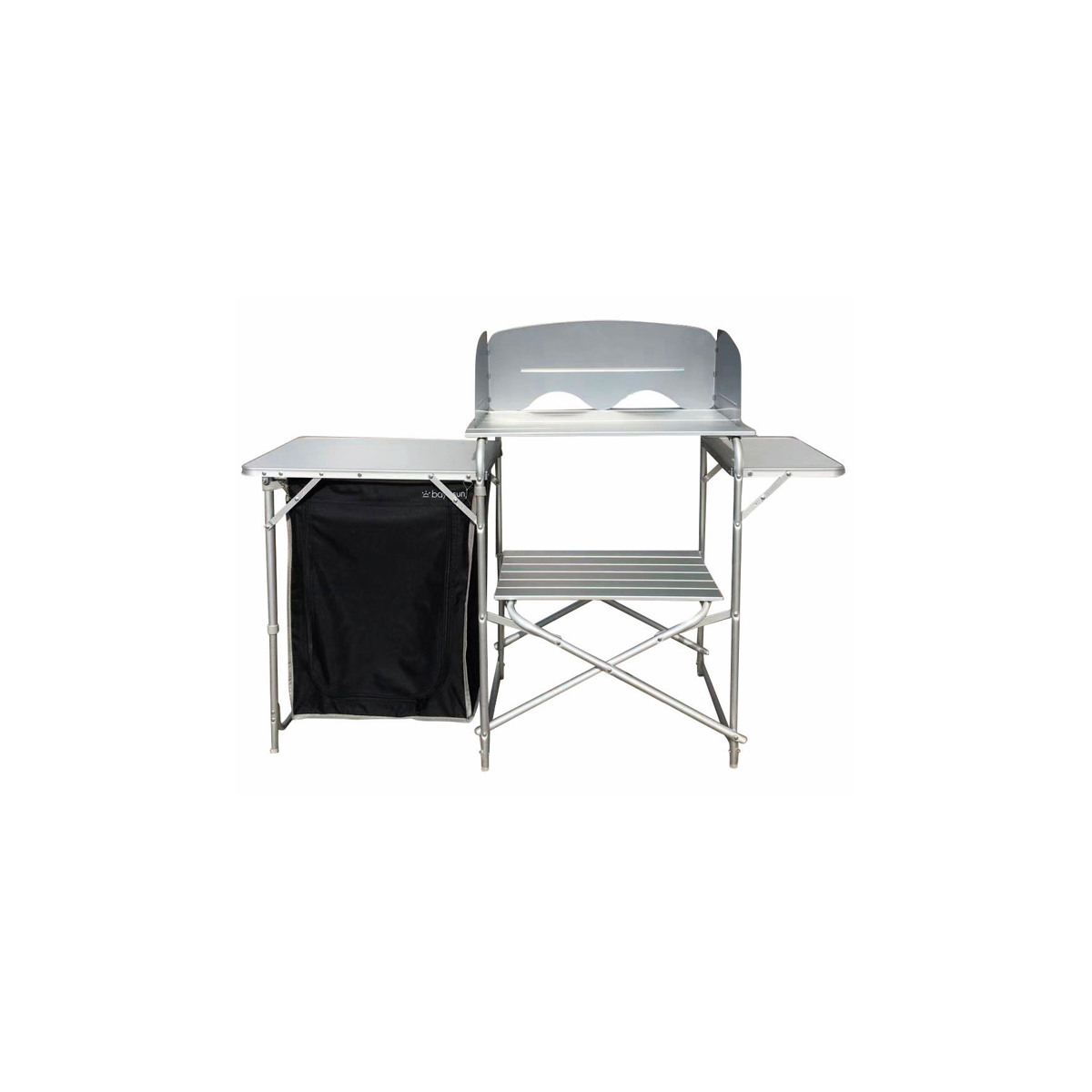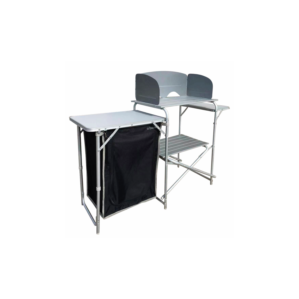Meuble pliant à la fois meuble de cuisine et meuble de rangement. Avec 2 plans de travail, une tablette, un pare-flamme pour la cuisine et un meuble 2 étagères pour le rangement de la vaisselle. Montage rapide et facile.