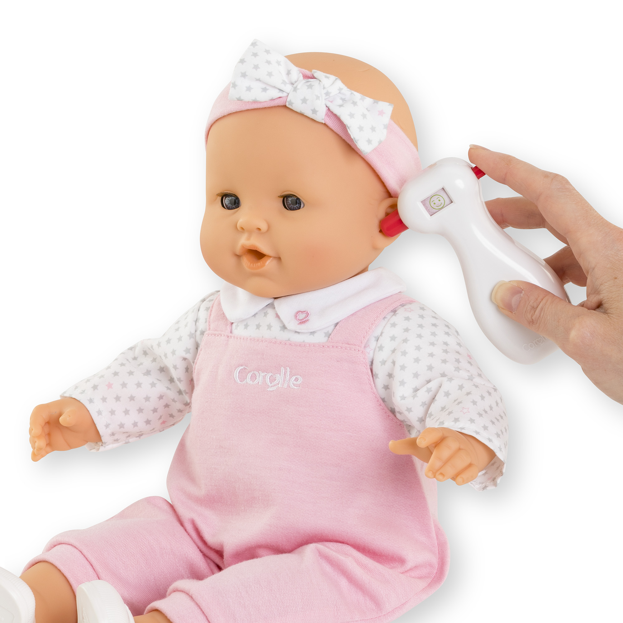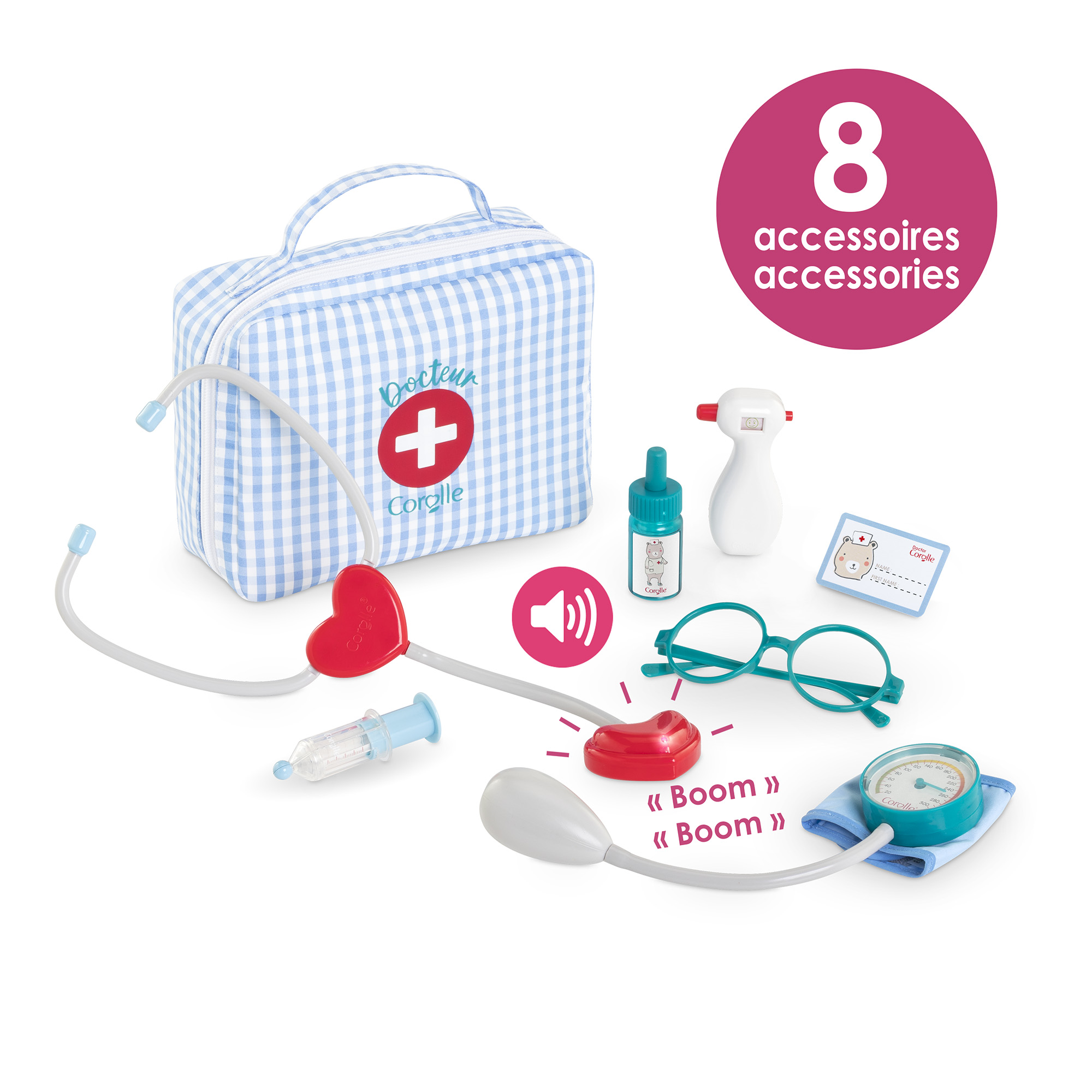 Idéal pour dédramatiser les visites chez le pédiatre ! La Valise Docteur et Accessoires est faite pour ausculter et soigner son petit ou grand poupon de 30/36 cm. Il comprend : - un stéthoscope qui simule le son des battements du cœur lorsqu'on appuie dessus - une seringue rétractable comme pour une vraie piqûre - un flacon de vitamines dont le capuchon se détache, - un tensiomètre avec l'aiguille qui tourne lorsque l'on appuie sur la poire, - un thermomètre avec un émoticône qui passe du vert au rouge pour indiquer si son poupon est malade ou non en appuyant sur un bouton, - une paire de lunettes pour enfant, - une carte de docteur - et une valise de docteur en tissu à carreaux pour tout ranger. Le stéthoscope fonctionne avec 3 piles AG13 (LR44) incluses. Les petits et grands poupons de 30/36 cm disposent d'une collection variée de vêtements et d'accessoires dans la gamme mon premier et mon grand poupon Corolle. Dès 18 mois.