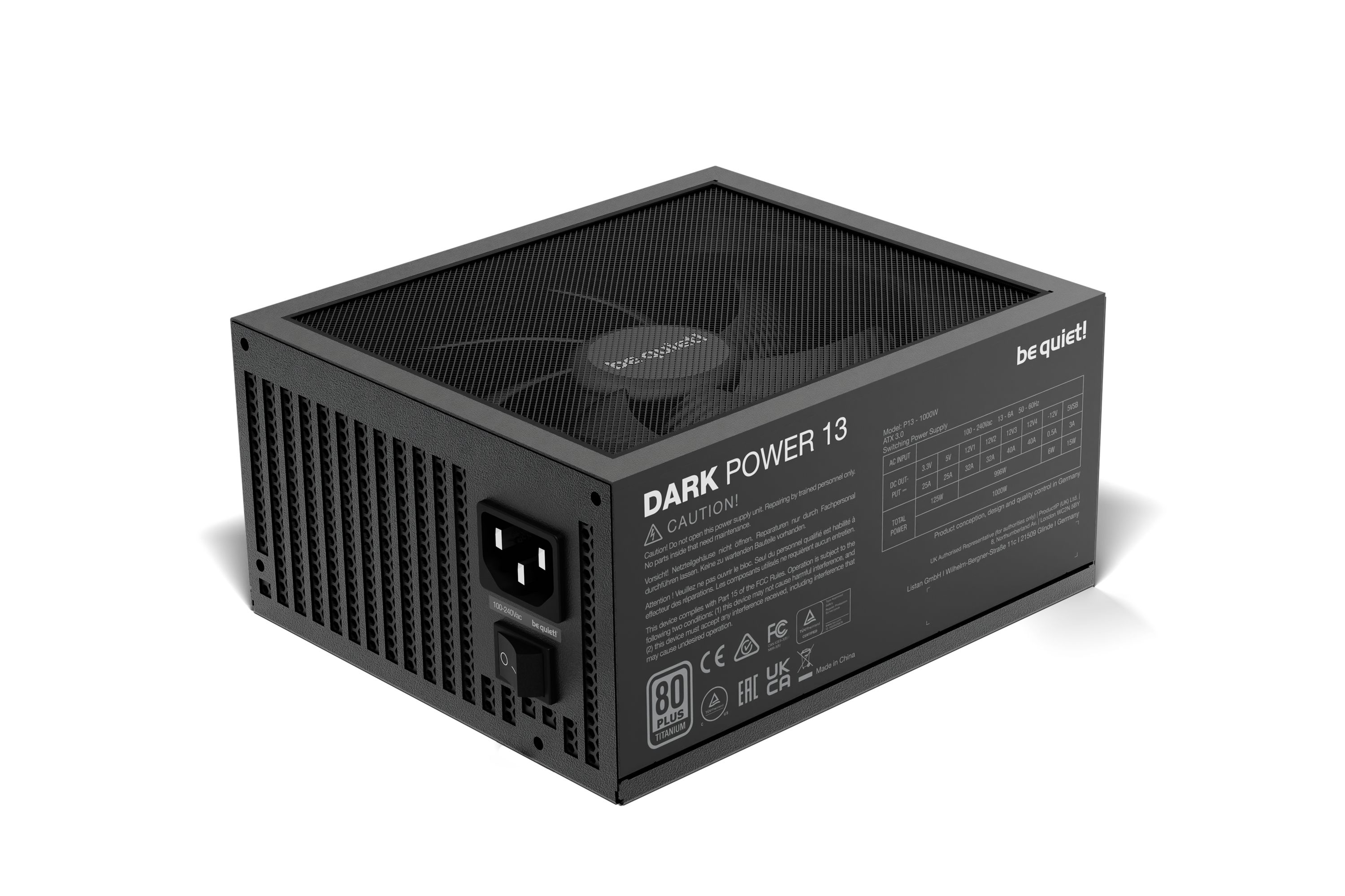 be quiet! Dark Power 13 1000 W | Alimentation ATX 3.0, 80 Plus Titanium. Puissance totale: 1000 W, Tension d'entrée AC: 100 - 240 V, Puissance de crête: 1100 W. Connecteur de la carte mère: 20+4 pin ATX, Longueur de câble d'alimentation de carte-mère: 60 cm, Longueur du câble d'alimentation SATA: 1050 mm. Utilité: PC, Facteur de forme de l'unité d'alimentation: ATX, Certification 80 PLUS: 80 PLUS Titanium. Couleur du produit: Noir, Type de refroidissement: Actif, Diamètre du ventilateur: 13,5 cm. Câbles inclus: CC, SATA