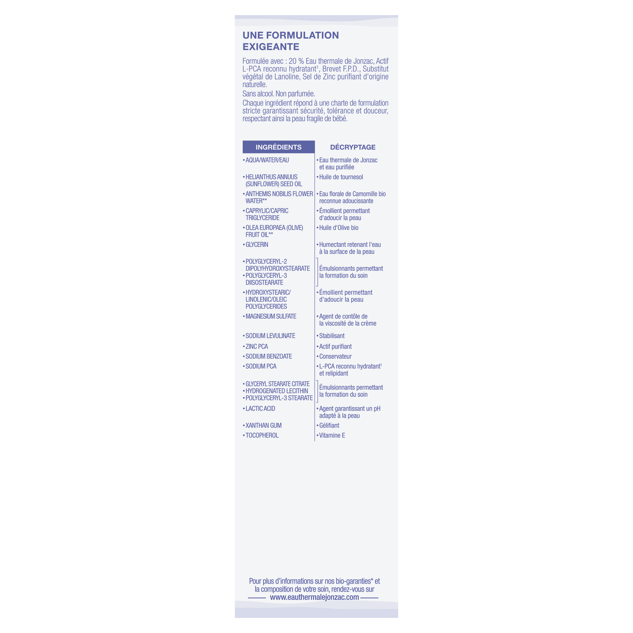 Aqua (Water)*, Helianthus Annus Sunflower Seed Oil, Anthemis Nobilis Flower Water*, Caprylic/Capric Triglyceride, Olea Europaea Olive Fruit Oil*, Glycerin, Polyglyceryl-2 Dipolyhydroxystearate, Polyglyceryl-3 Diisostearate, Hydroxystearic/Linolenic/Oleic Polyglycerides, Magnesium Sulfate, Sodium Levulinate, Zinc PCA, Sodium Benzoate, Sodium PCA, Glyceryl Stearate Citrate, Hydrogenated Lecithin, Polyglyceryl-3 Stearate, Lactic Acid, Xantahn Gum, Tocopherol. * issu de l'agriculture biologique.