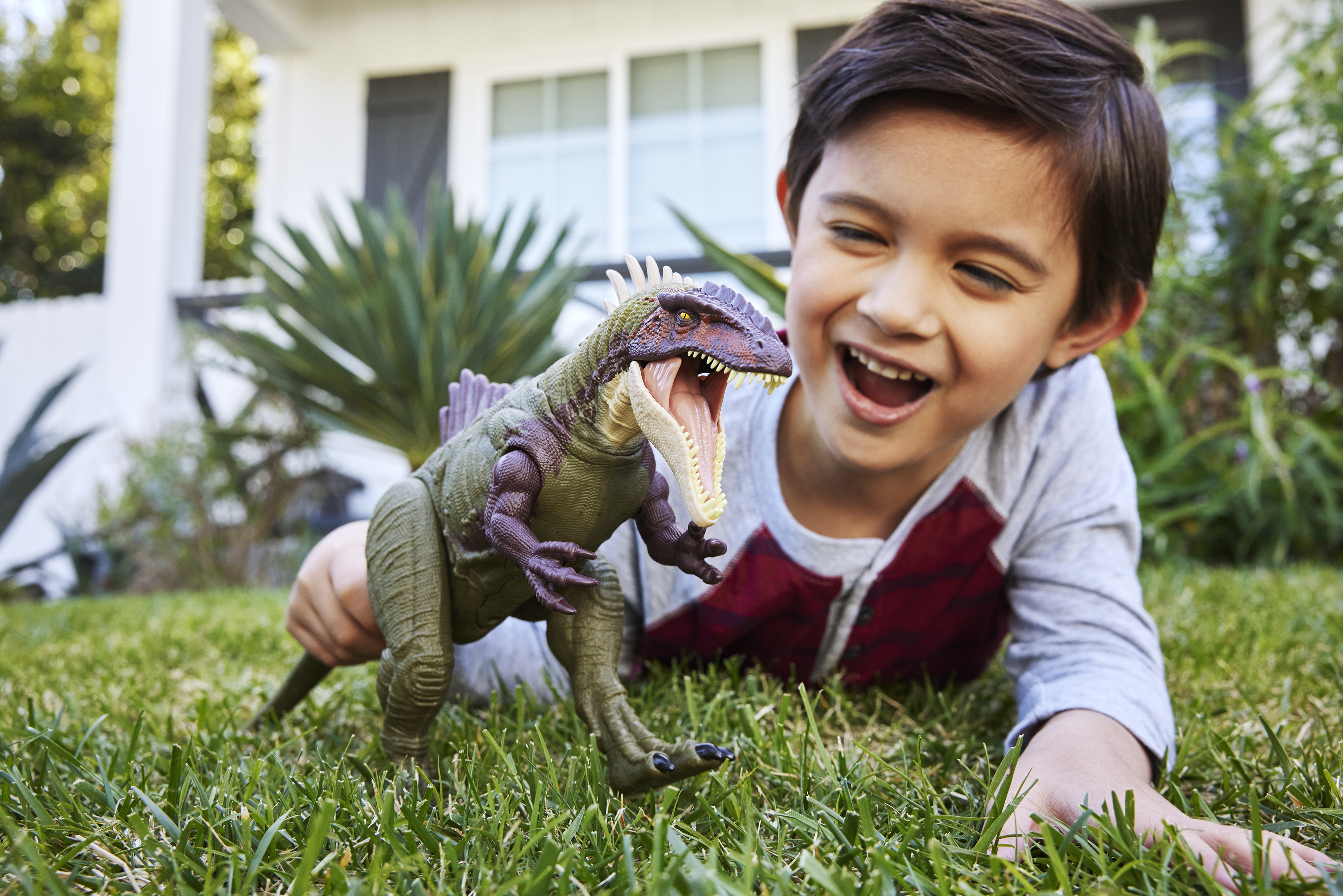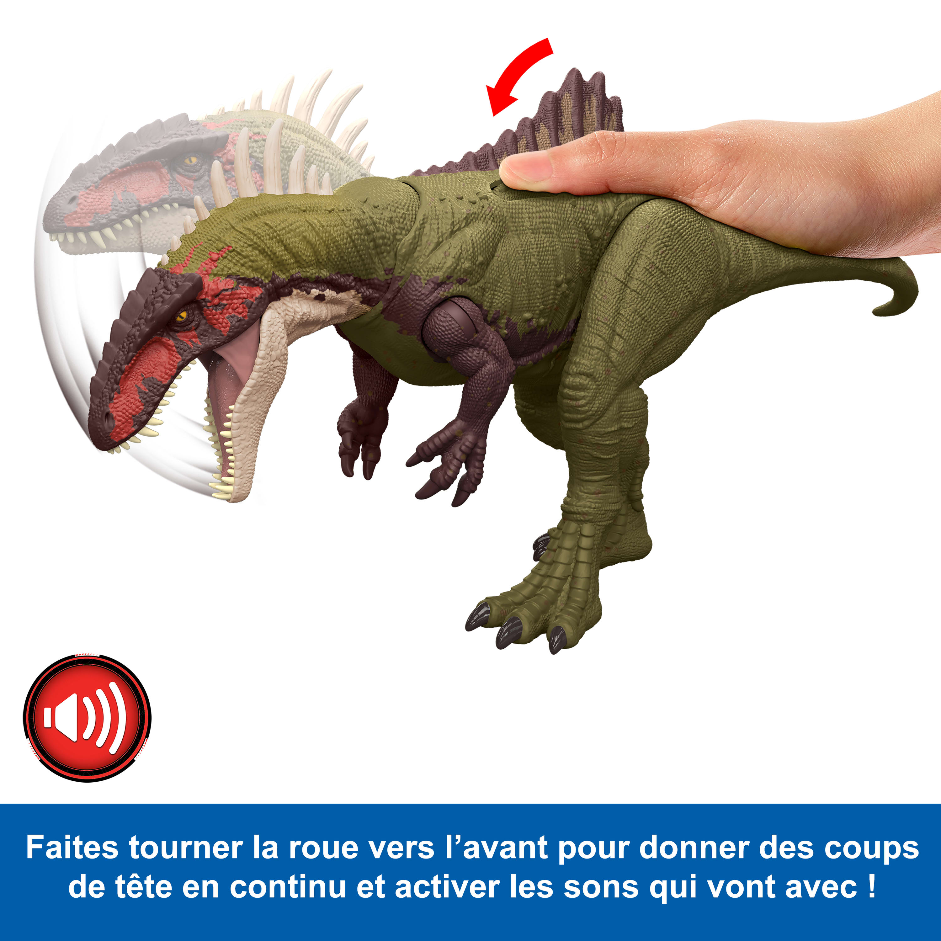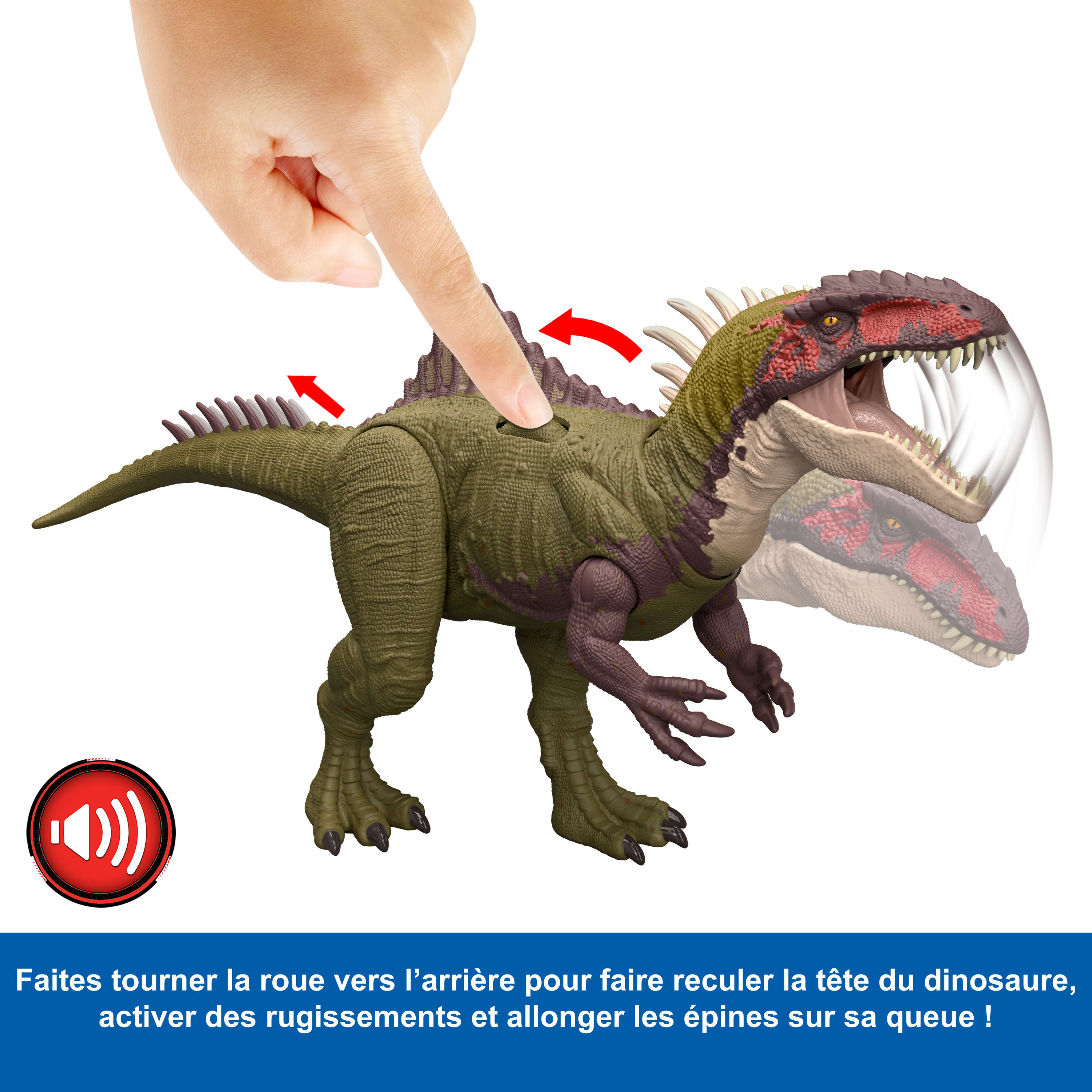 Dinosaure à l’échelle avec des détails liés à son habitat naturel. Double attaque : mâchoire et cou, au niveau de la queue accompagné d’un rugissement.