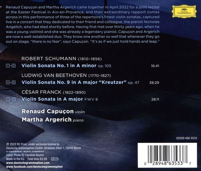 Deutsche Grammophon présente le premier album de Renaud Capuçon pour le label jaune, dans le cadre de leur nouvelle collaboration.Accompagné dela pianiste de légende Martha Argerich,Renaud Capuçon interprète trois des plus belles sonates pour violon et piano du répertoire : l'opus 105 de Schumann, la ''Kreutzer\"de Beethoven, et la Sonate de César Franck. Interprètations enregistrées lors du Festival de Pâques d'Aix-en-Provence en avril 2022. À noter, le lien extraordinaire entre les deux interprètes est évident dans ce récital dédié au pianiste Nicholas Angelich, leur ami et partenaire décédé quelques jours auparavant.