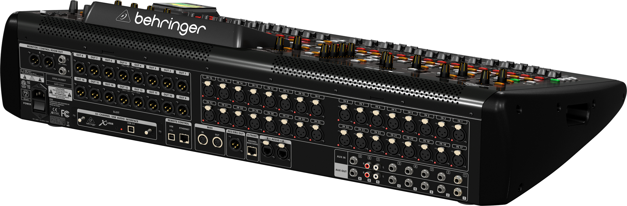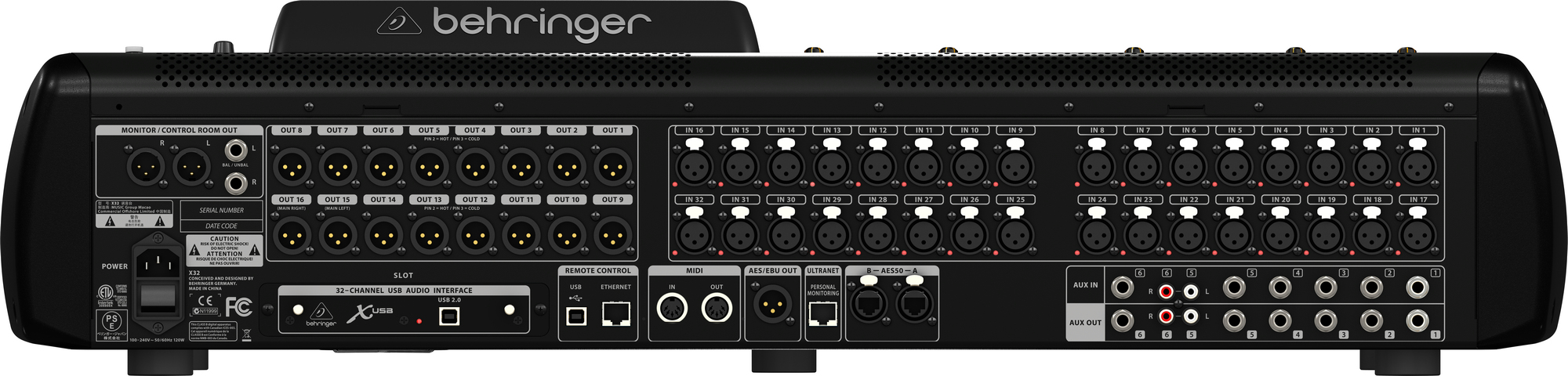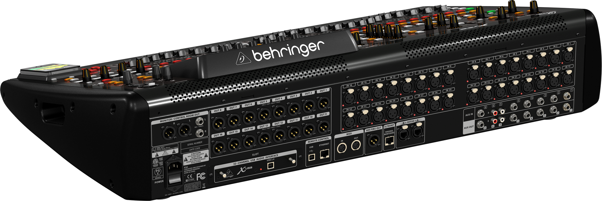 Behringer X32. Quantité de canaux: 40 canaux, Traitement numérique du son: 24 bit, Gamme de fréquence: 10 - 22000 Hz. DHT, distorsion harmonique totale: 0,006%. Casque connection: 6,3 mm. Largeur: 900 mm, Profondeur: 528 mm, Hauteur: 200 mm