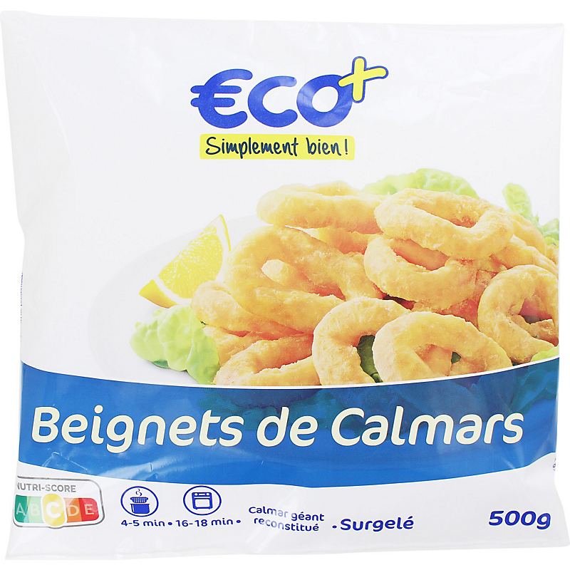 Anneaux de calmars géants reconstitués enrobés de pâte à beignet, panés et préfrits, surgelés ECO +