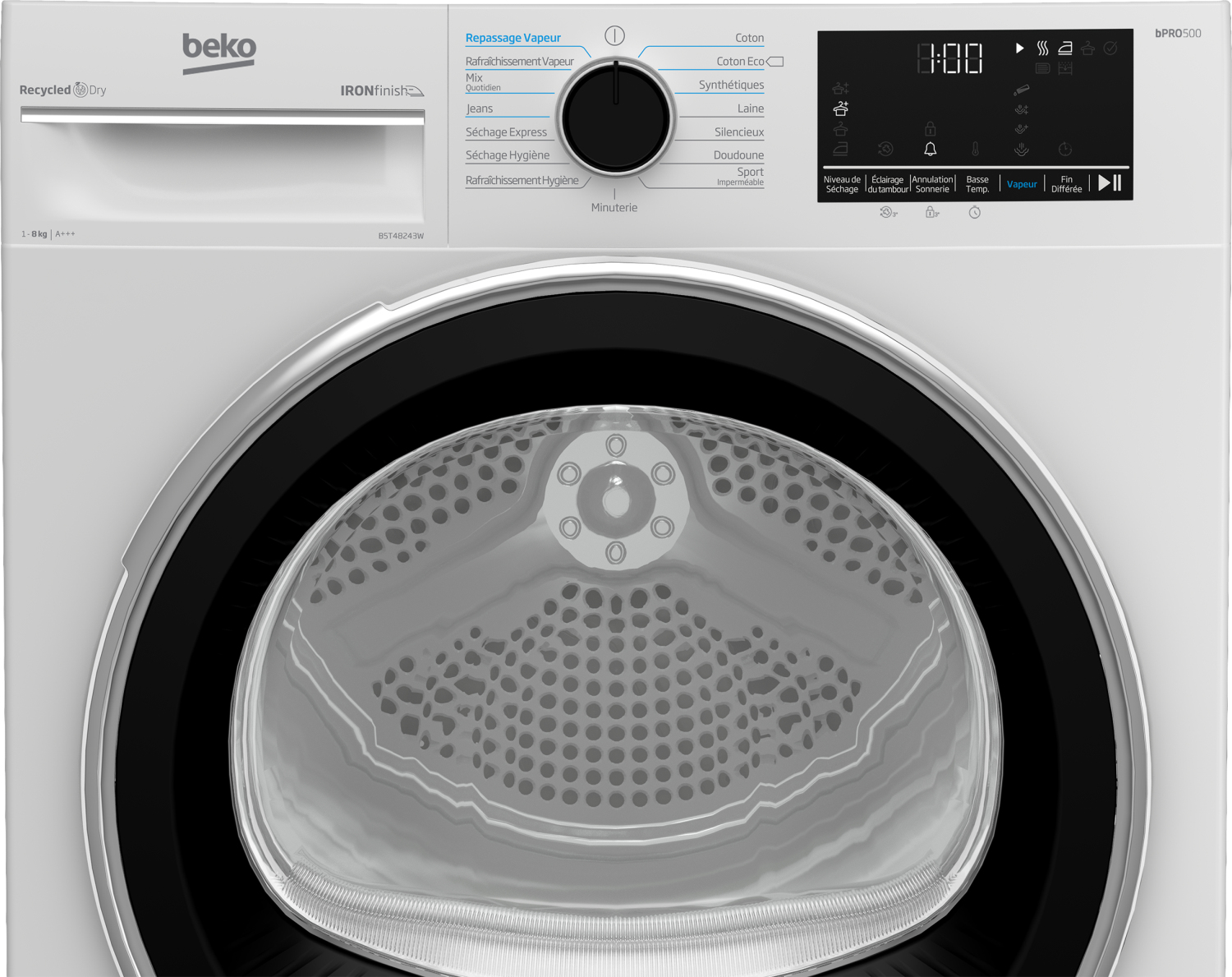 Programme(s) Programmes de séchage:Coton;Cotton eco;Doublure/duvet;Hygiène/anti-allergie;Jeans/denim;Mix;Rapide;Rapide 14 min;Rafraîchir;Shirts;Silence;Sport;Vapeur;Synthétiques;Chronométré;Laine