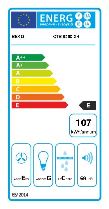 Beko CTB 6250 XH. Puissance d'extraction maximum: 420 m³/h, Type d'extraction: Conduit / Recirculation, Classe d'efficacité dynamique du fluide: E. Type: Intégré au plafond, Couleur du produit: Acier inoxydable, Diamètre du conduit d'évacuation: 15 cm. Type de filtre à graisse: Métal. Puissance de l'ampoule: 28 W, Nombre d'ampoules: 2 ampoule(s), Éclairement: 113 lux. Classe d'efficacité énergétique: D, Consommation annuelle d'énergie: 88,4 kWh, Plage d’efficacité énergétique: A++ à E