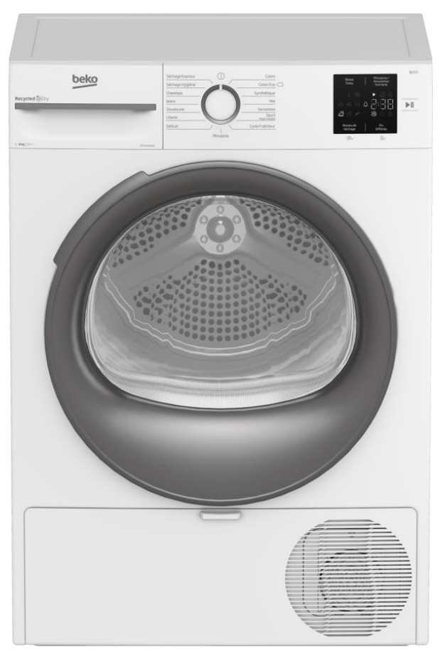 Nos sèche-linge intègrent des matériaux recyclés, dont des bouteilles en plastique. Environ 30 % des composants sont conçus à partir de ces matériaux recyclés, avec jusqu’à 15 % de plastique recyclé dans les sèche-linge.