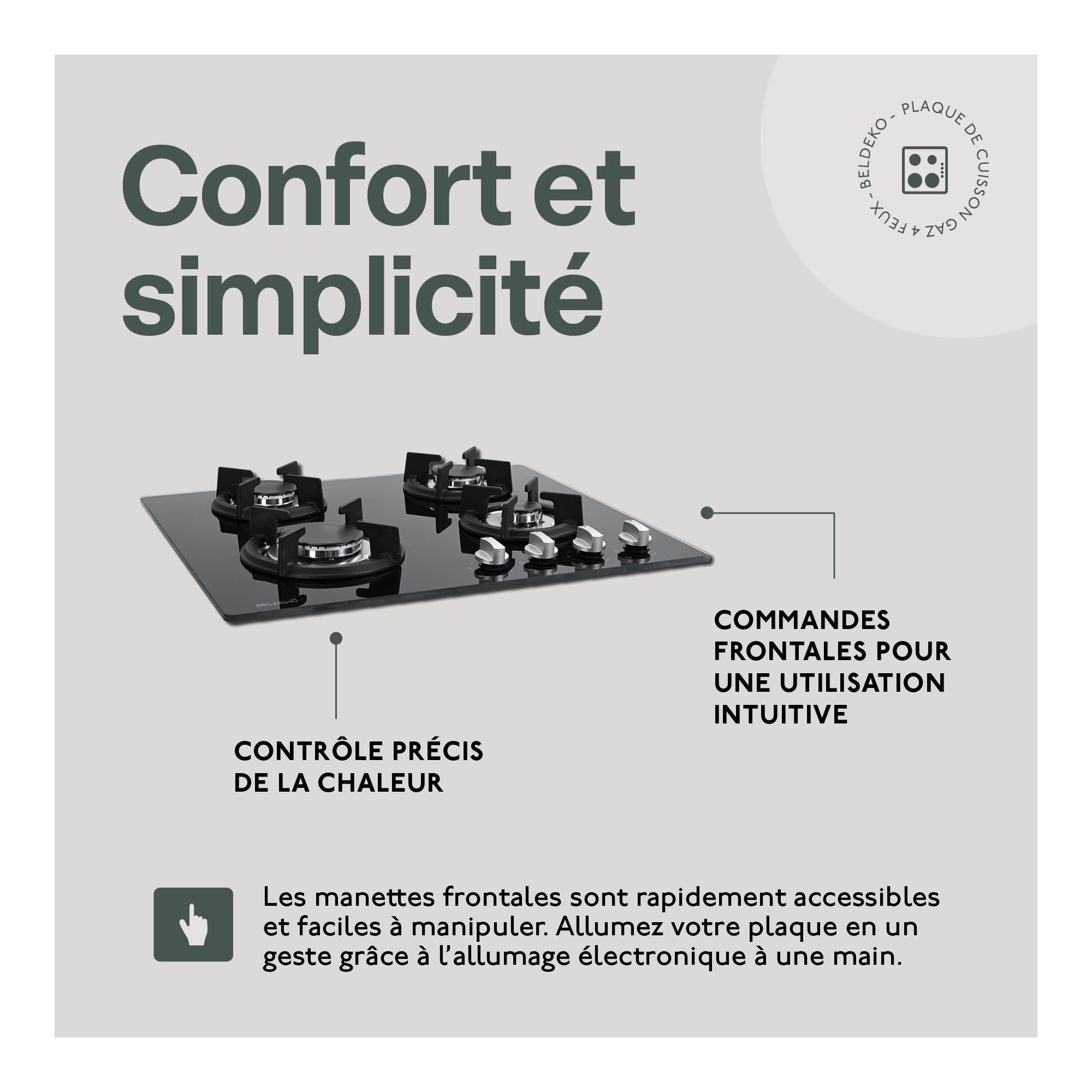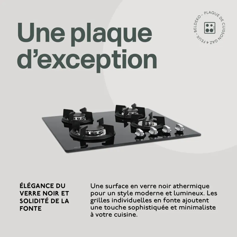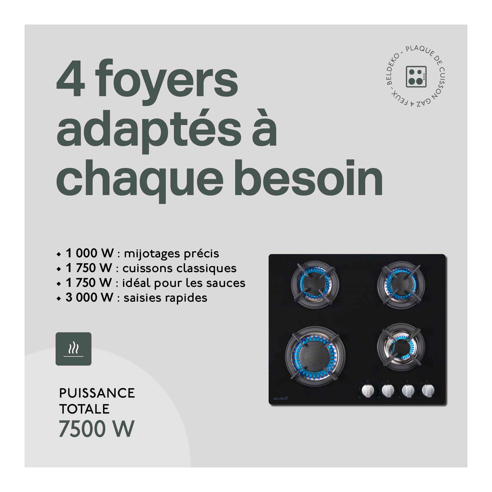 | Libellé | BELDEKO - Plaque de cuisson gaz 4 feux verre noir - 7500W - Grille fonte |