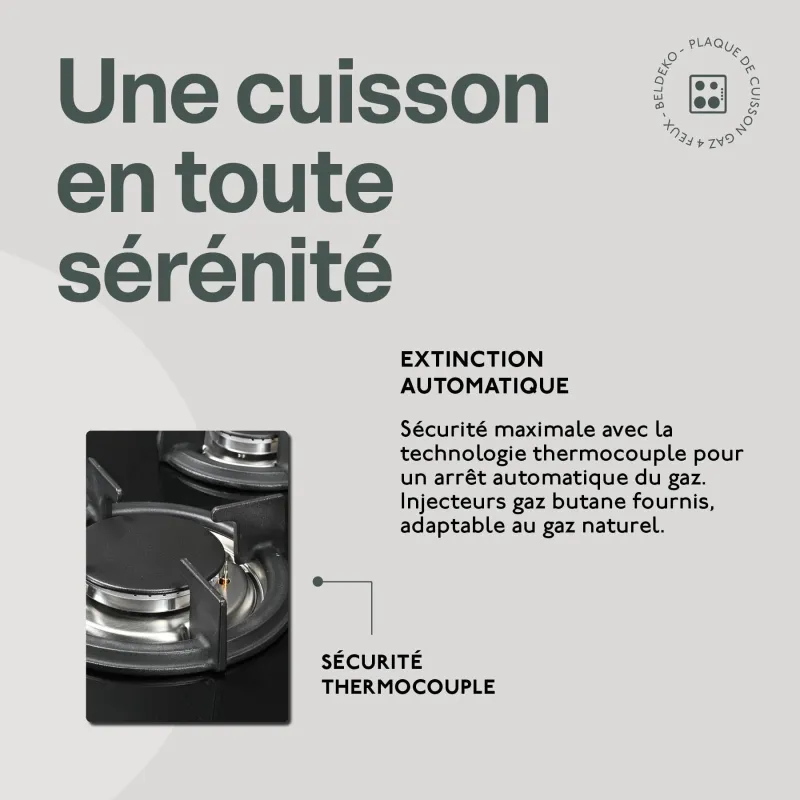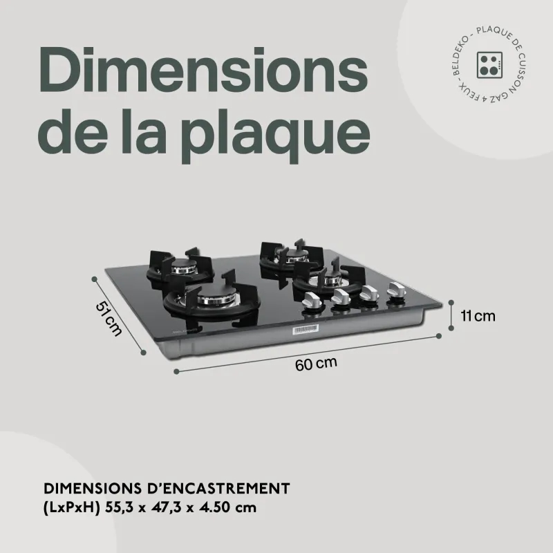 Table de cuisson gaz encastrableVerre athermique haute résistanceGrilles et chapeaux de brûleurs en fonteLivré en gaz naturel, injecteurs gaz butane fournisCordon de raccordement (1 mètre) et prise électrique fournisRaccord pour tuyau souple fourniSécurité thermocouple : système permettant l'arrêt automatique de l'arrivée du gaz lorsque la flamme s'éteint accidentellementFICHE TECHNIQUEInformationsgénéralesRéférenceBTG4Z-F01VNOMarqueBELDEKOCatégorie du produitTable de cuisson gaz encastrableColorisVerre NoirOrigineFabriqué en RPCMatièresSurface : verre athermique Supports de brûleurs : inoxGrilles et chapeaux de brûleurs : fonteCaractéristiquesDimensions de la table (L x P)60 x 51 cmDimensions d'encastrement (L x P x H)55,3 x 47,3 x 4.50 cmPoids11,9 kgType de foyerGazNombre de foyer4PuissanceAV D brûleur auxiliaire : 1000 WattsAV G brûleur rapide : 3000 WattsAR D brûleur semi rapide : 1750 wattsAR G brûleur semi rapide : 1750 WattsType des commandesManettes (coloris gris silver)Allumage électroniqueOui (1 main)"Les plus"Sécurité thermocoupleAccessoiresInjecteurs gaz butane fournisGarantieDurée2 ansPrise en chargePièces, mains d'œuvre et déplacementsType de garantieConstructeur