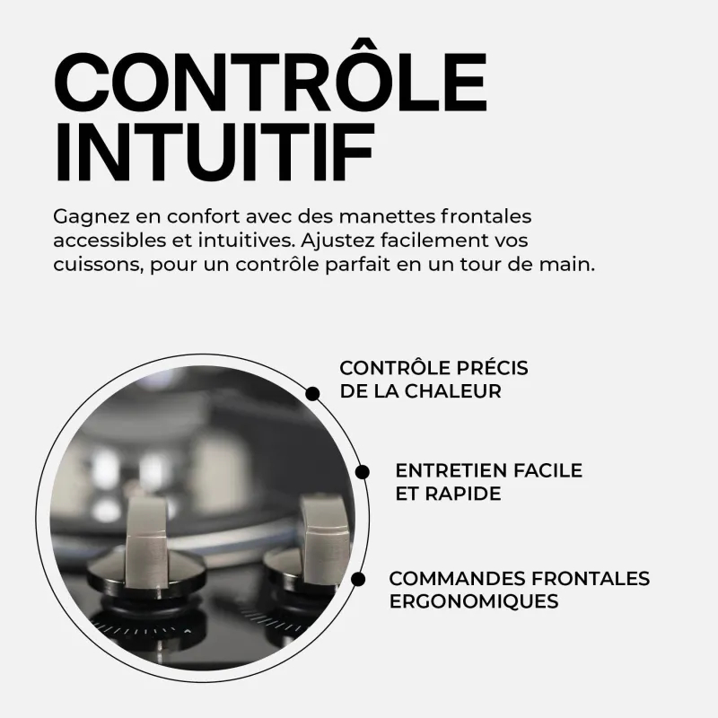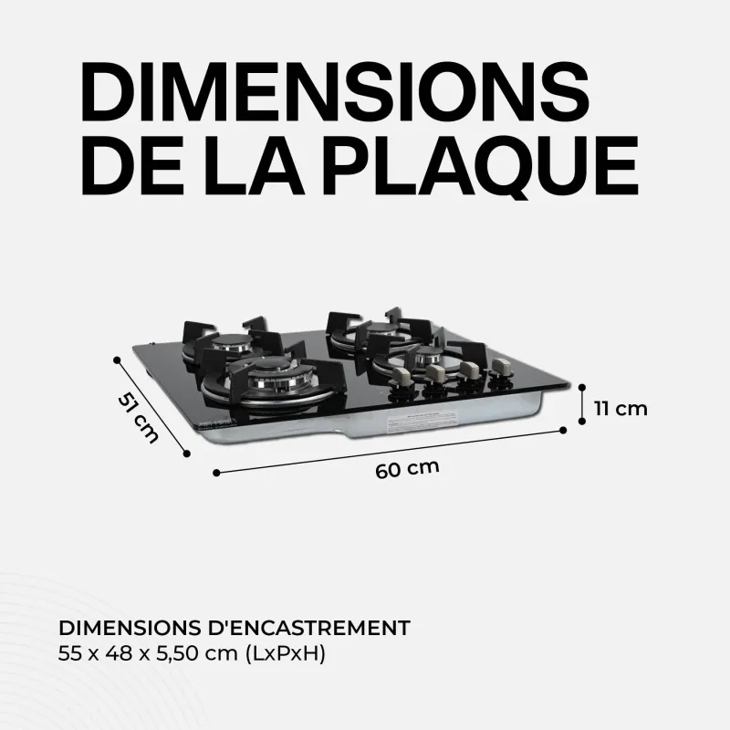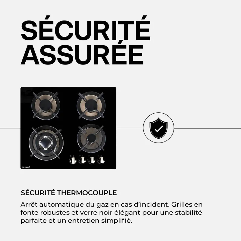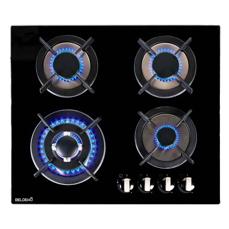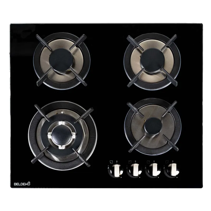Libellé BELDEKO - Plaque de cuisson gaz - 4 Foyers - Double couronne - 7800W - encastrable - verre noir
