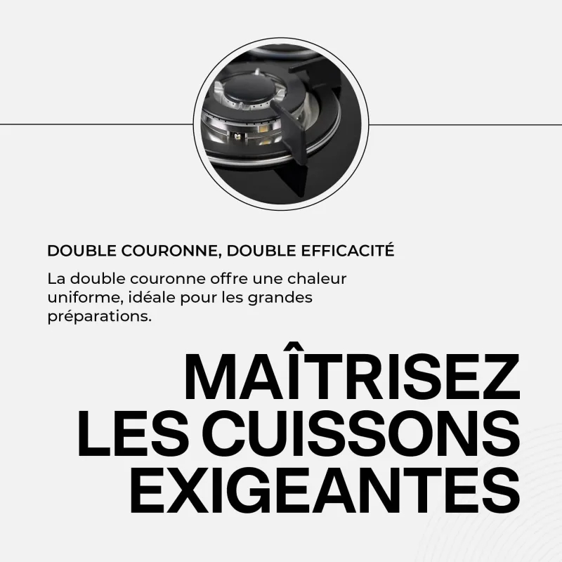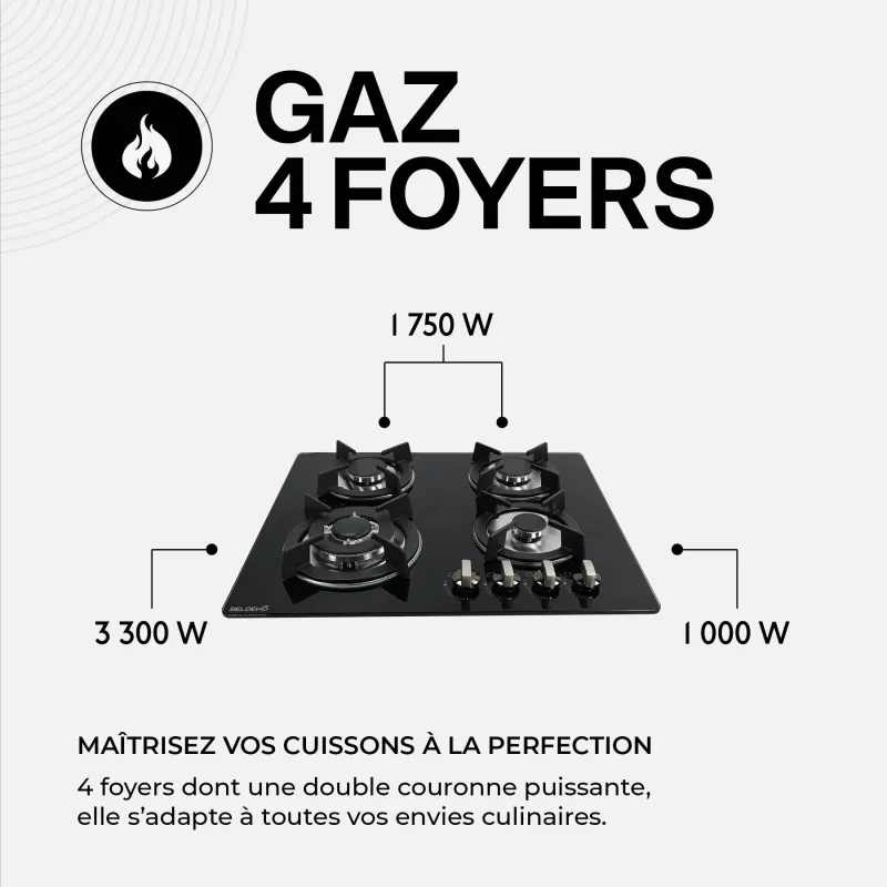 BELDEKO - Plaque de cuisson gaz - 4 Foyers - Double couronne - 7800W - encastrable - verre noir