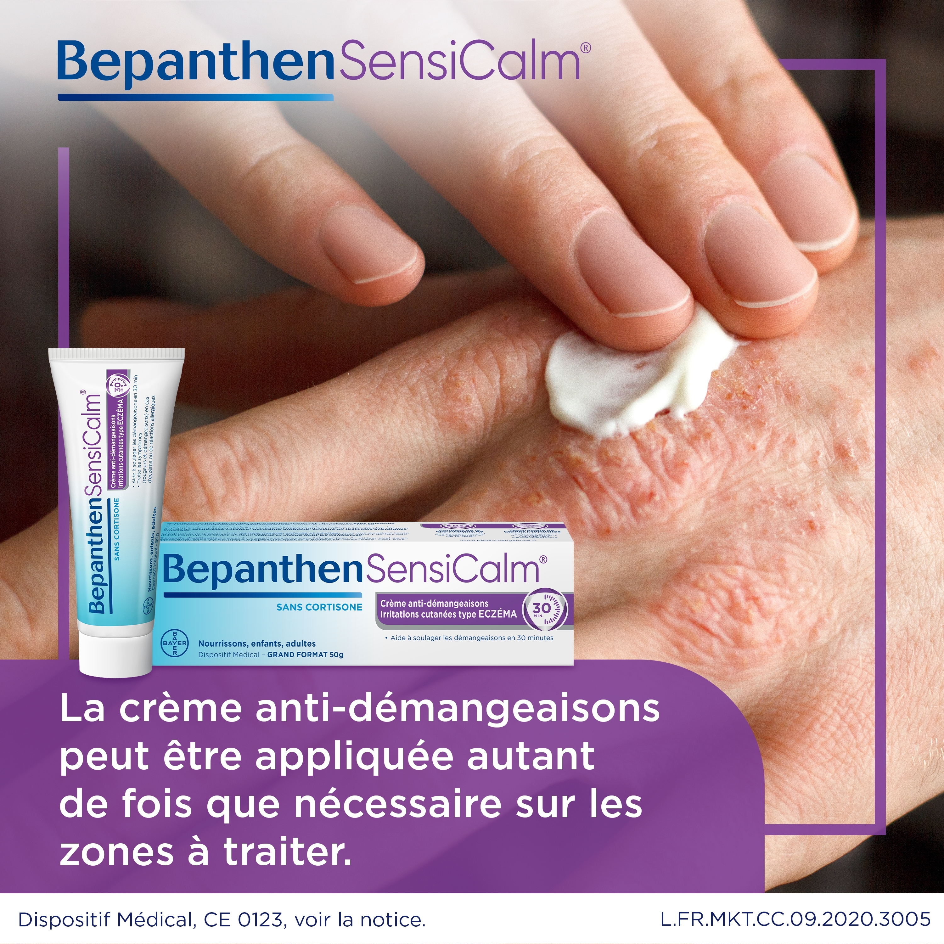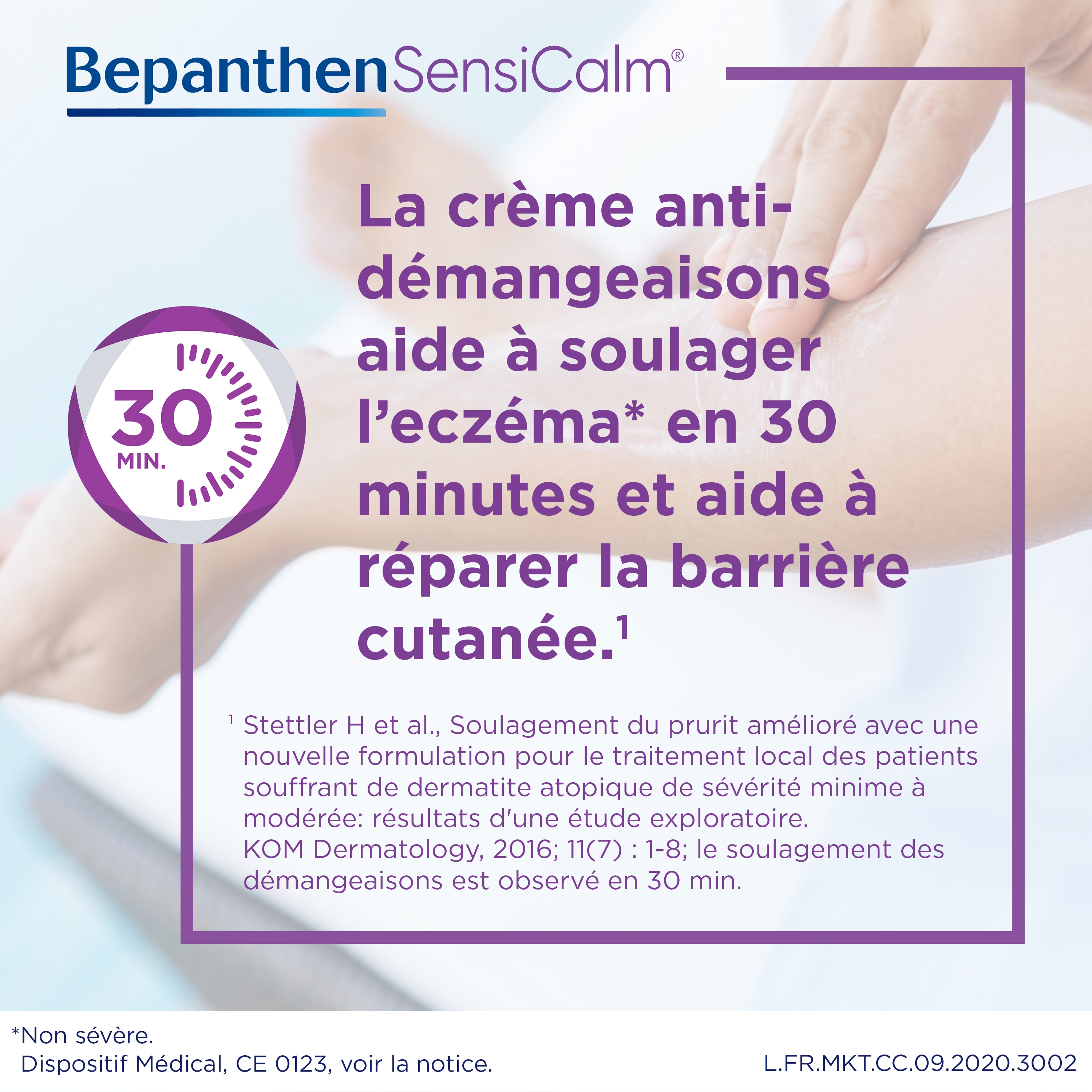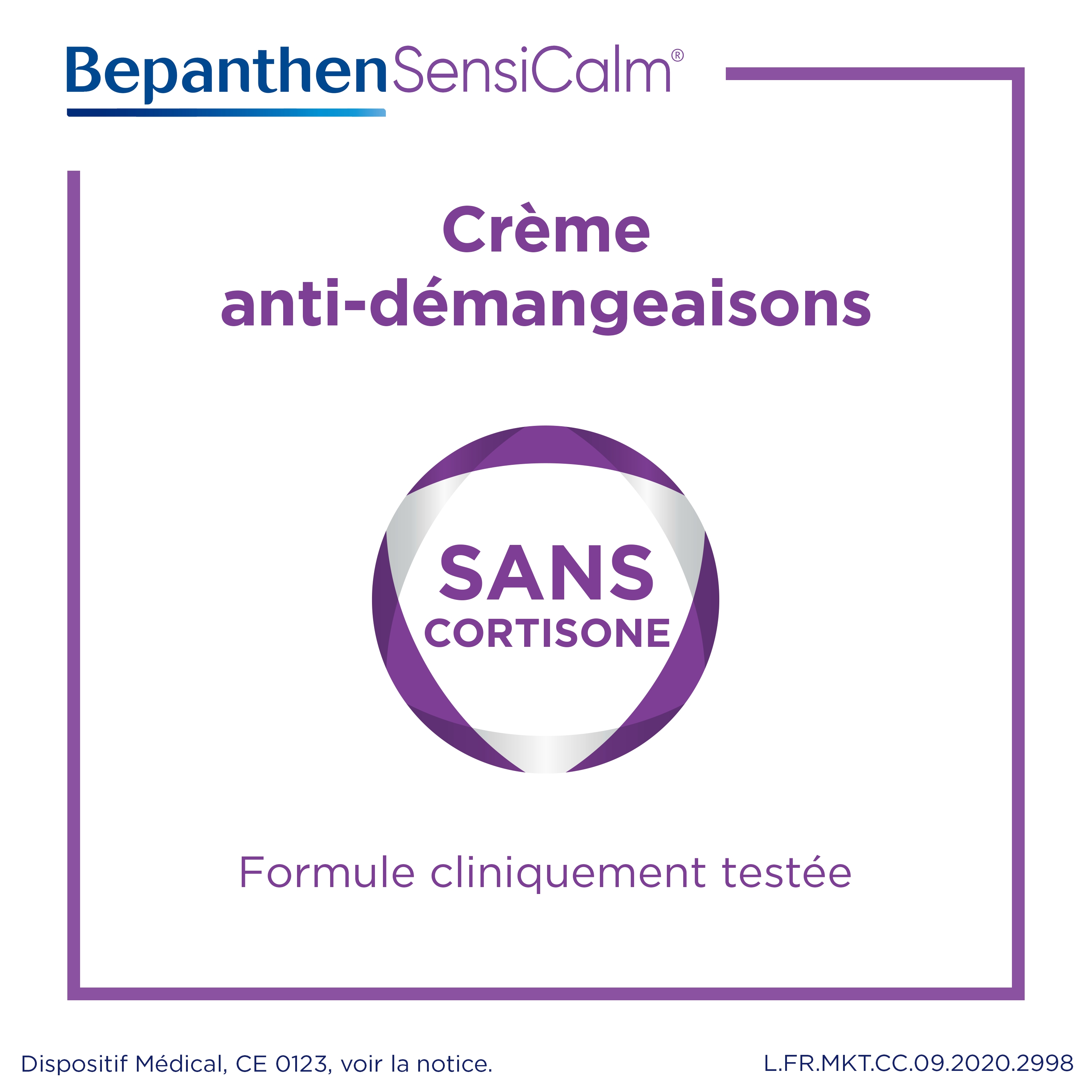 BepanthenSensiCalm® est une crème anti-démangeaisons qui soulage rapidement les démangeaisons et les rougeurs causées par les irritations cutanées. De telles irritations de la peau peuvent survenir notamment lors de la dermatite atopique, les autres eczémas et certaines réactions allergiques cutanées. Cette crème sans cortisone est cliniquement testée. Grâce à ses actifs, BepanthenSensiCalm permet de réparer la barrière cutanée empêchant ainsi l’entrée d'agents extérieurs irritants et hydrate la peau grâce à la pro-vitamine B5 et autres agents hydratants. BepanthenSensiCalm® convient pour les nourrissons, les enfants et les adultes. Elle peut être utilisée autant de fois que nécessaire sur les zones à traiter (corps et visage dont les paupières). S'utilise seule ou en association avec des traitements dermocorticoides.