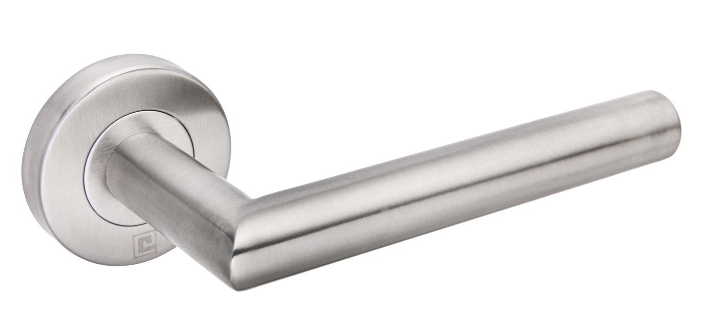 La conception met l'accent sur la cohérence visuelle et la tenue dans le temps. La rosace se fond naturellement dans la surface de la porte et participe à un maintien stable, tandis que la béquille creuse apporte une sensation d'équilibre sans alourdir l'ensemble. La finition inox conserve un aspect neutre, facile à associer à différents styles d'aménagement.