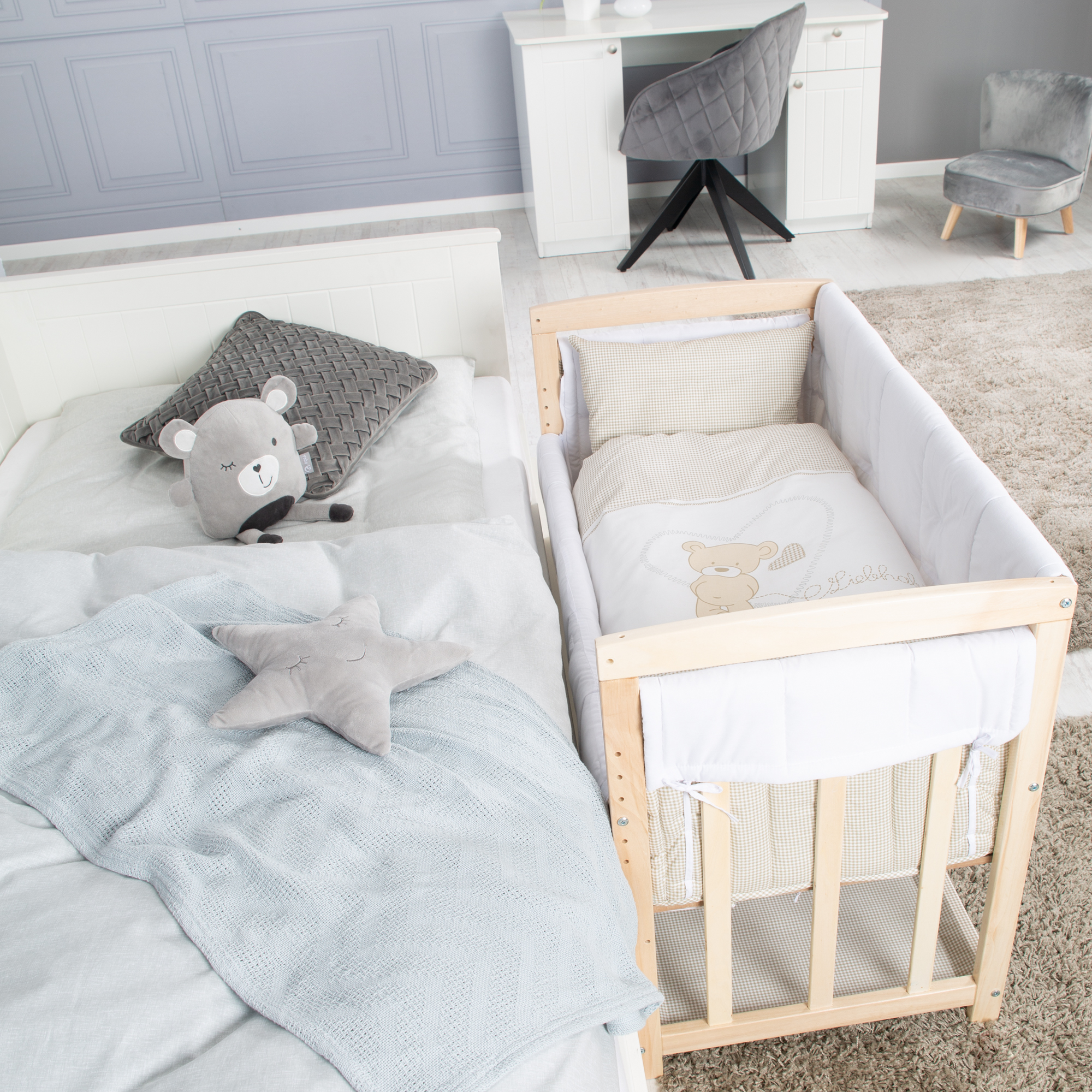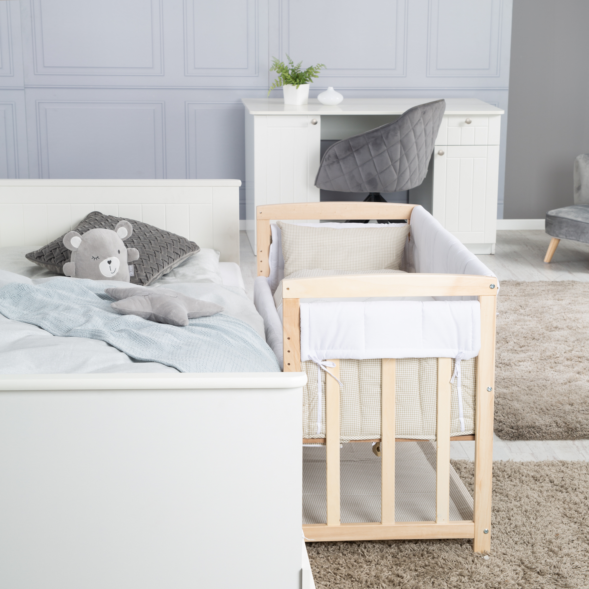Le berceau cododo roba Babysitter 4 en 1 au joli design "Liebhabaer" est livré avec un matelas en mousse, une literie, un coutil, un nid rembourré, un baldaquin, une barre de baldaquin et des patins pour le bercer. Le lit cododo peut être facilement attachée à n'importe quel lit parental avec les sangles incluses afin qu'il ne puisse pas glisser. Réglable en hauteur sur 42,5 cm pour s'adapter à toutes les hauteurs de lit, y compris les lits à sommier tapissier. La literie 2 pièces comprend un oreiller (40 x 35 cm) et une couette (80 x 80 cm). Le rembourrage est composé d'une fibre climatique respirante remplie de 100 % de polyester, la housse est en 100 % de coton. Le berceau et les accessoires sont produits conformément aux dernières normes de sécurité de l'UE (EN 1130:2019). Tous les matériaux utilisés sont certifiés non-toxiques et régulièrement testés. Le lit de chambre avec barres plates est fabriqué en bois massif (hêtre). Dimensions de la surface de couchage : 90 x 45 cm. Dimension totale : hauteur avec baldaquin 145 cm x largeur (avec/sans patins) 50/76cm x profondeur 95cm.