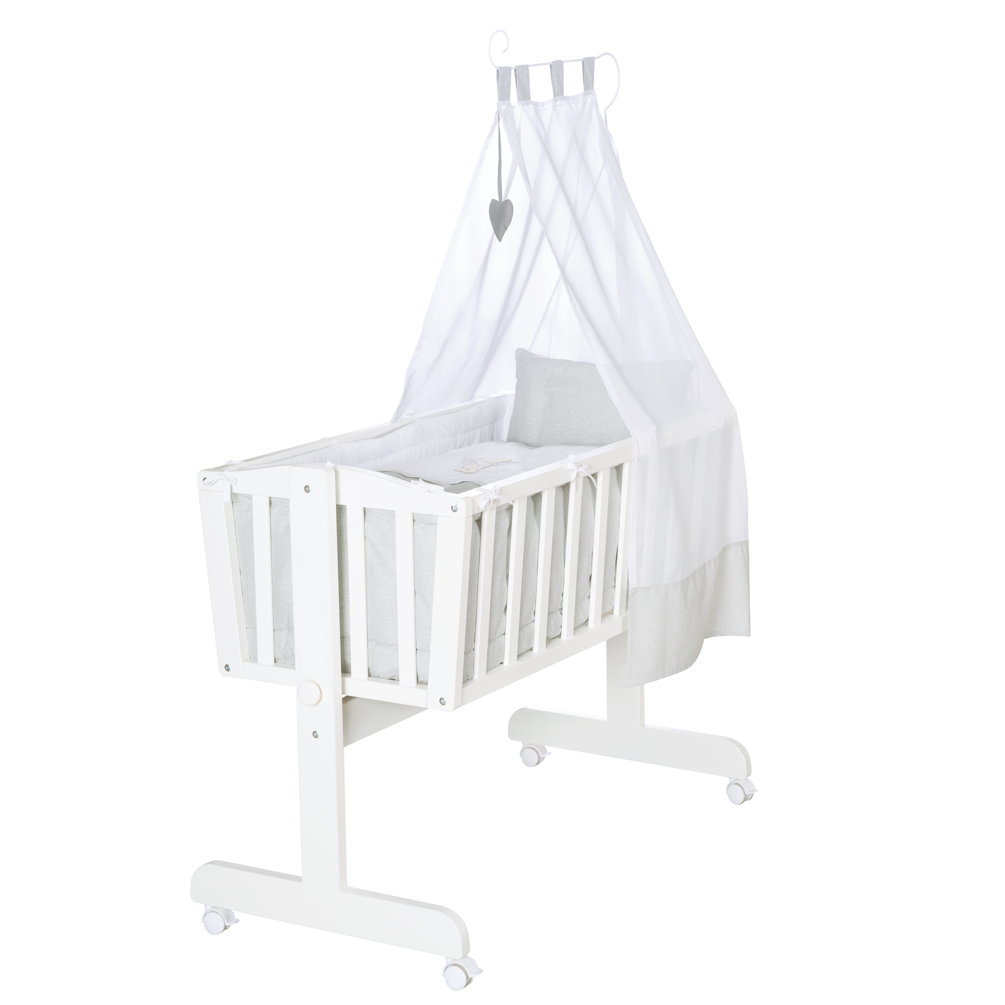 Ce berceau complet se compose d'un berceau, de linge de berceau 80x80 (coussin et couette inclus) , d'un matelas a surface allongée 90x40, d'un tour de lit, d'un ciel de lit avec un support ciel de lit, et aussi des roulettes avec freins. Le berceau est équipé avec barres plates robustes et de haute qualité, ainsi que d'une fonction basculante avec système de verrouillage. Le berceau basculante peut être transformé avec le verrouillage en berceau fixe. Le berceau est utilisable dès la naissance jusqu'à environ 6 mois ou jusqu'à ce que le bébé puisse se relever. Les textiles sont fabriqués en 100% coton testé pour les substances nocives et offrent une atmosphère optimale pour le dodo. La couette est composée d'un rembourrage en fibres respirantes et thermo-compensatrices en 100% polyester avec un tissu 100% microfibre. La couette peut être utilisée toute l'année, est très résistante et facile à laver, car elle ne se déplace pas dans la housse pendant le lavage grâce aus matelassage. La literie avec 2 pièces est composé de coussin de 40x35cm et une couverture 80x80cm. La couette des enfants est composée d'un rembourrage en fibres respirantes et thermo-compensatrices en 100% polyester avec un tissu 100% microfibre. Tous les matériaux utilisés sont certifiés et contrôlés régulièrement pendant la production. Tous les produits roba sont créés sur la base de ses 90 années d´expérience, développés selon les normes de sécurité européennes, pensés avec intelligence et faits pour les familles.