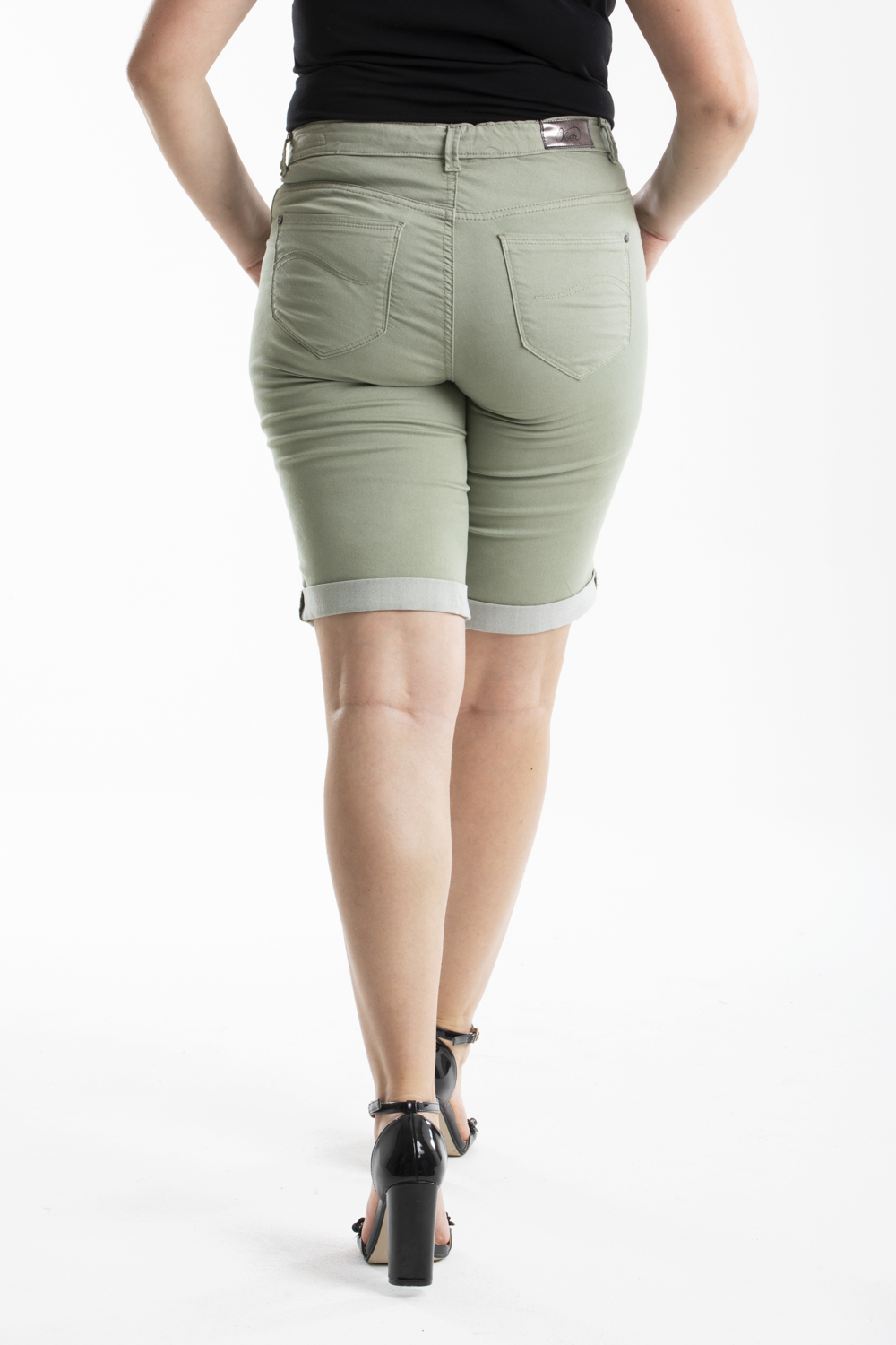 Bermuda à revers, 5 poches, taille haute, braguette à fermeture éclair, demi ceinture élastiquée sur l'arrière, twill de couleur, COTON 74% POLYESTER 24% ÉLASTHANNE 2%. La longueur de l'entrejambe est de : 30 cm pour une taille 40. Le mannequin porte une taille 44.
