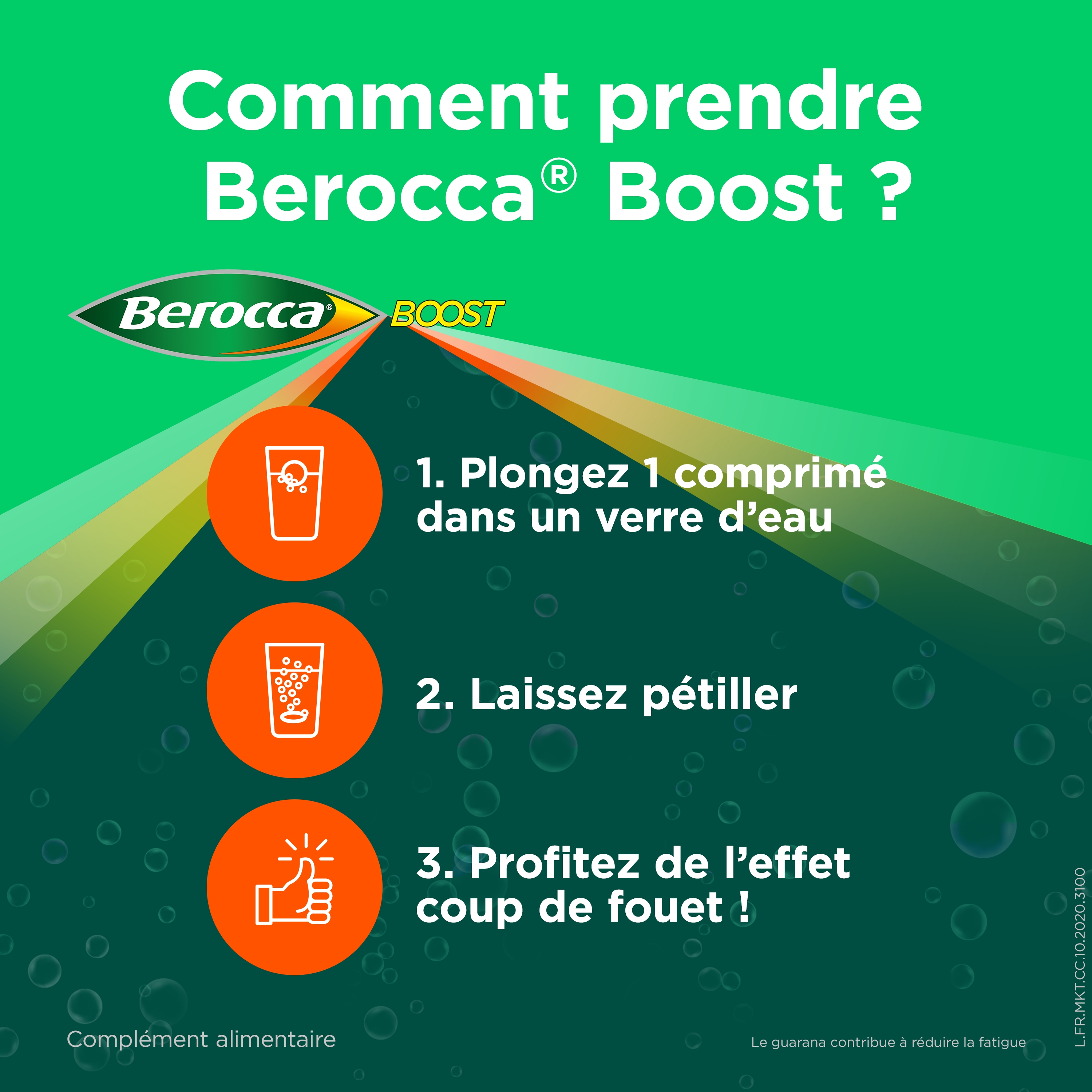 Dissoudre un comprimé par jour de Beroccaboost dans un grand verre d'eau, à renouveler les jours où le besoin s'en fait sentir.