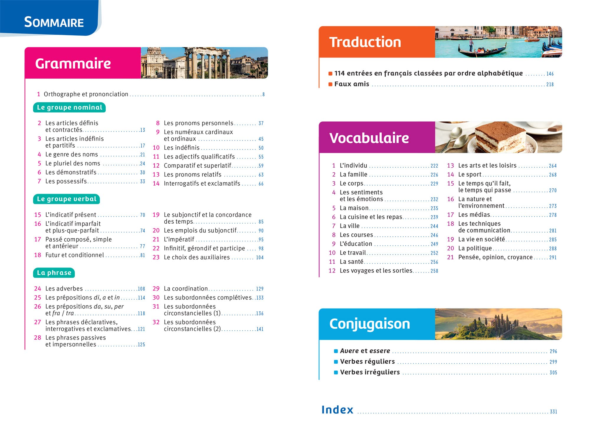 Inspirés de la vie quotidienne italienne, de nombreux exemples sont présents pour expliquer un point de grammaire ou un point de passage délicat du français à l’italien, pour mémoriser une structure de communication ou pour apprendre du vocabulaire en contexte.
