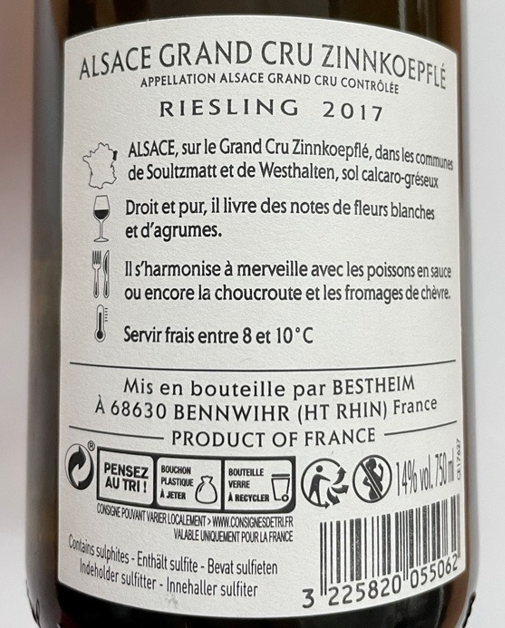 | Libellé | Bestheim Grand Cru Zinnkoepflé, 2017 - Alsace Riesling Grand Cru AOP - Blanc Sec - 75 cl |