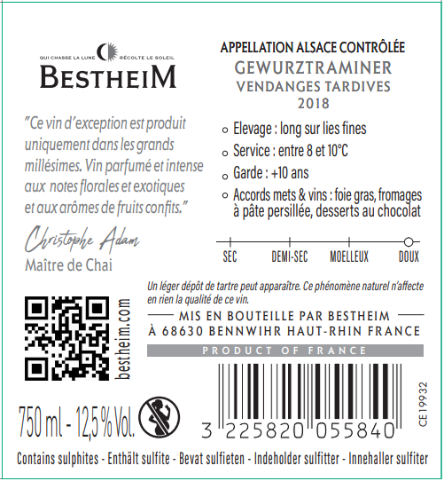 | Libellé | Bestheim Vendanges Tardives, 2020 - Alsace Gewurztraminer AOP - Blanc Moelleux - 75 cl |
