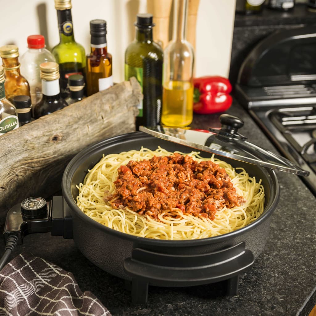 Le bord extra-haut la rend particulièrement adaptée à la préparation de plats comme les pâtes, la paella, le chili con carne, les boulettes de viande. Cette poêle électrique multifonctionnelle est équipée d'un thermostat amovible réglable à 5 positions, avec un voyant lumineux prêt à l'emploi. La poêle à frire est facile à nettoyer grâce à son revêtement antiadhésif, de sorte qu'il ne soit pas nécessaire d'utiliser de l'huile ou du beurre lors de la cuisson. Les pieds antidérapants la rendent stable sur n'importe quelle surface.