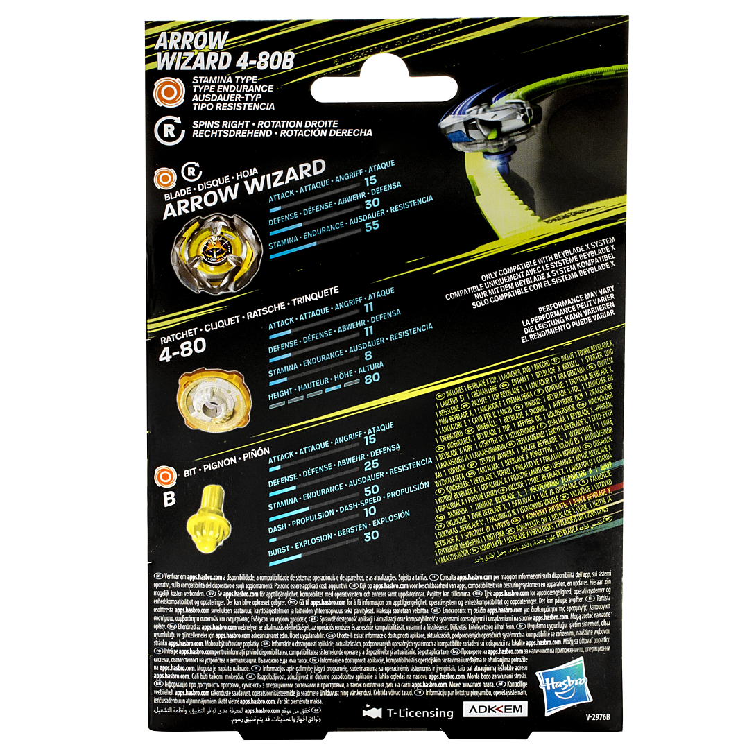 | La boîte contient | Toupie Arrow Wizard 4-80B (stamina/endurance), lanceur officiel |