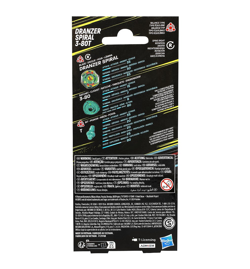 | Plus produit | FAIRE SES PREUVES AU COMBAT : Beyblade X offre tout le frisson de la compétition avec des combats de toupies intenses qui incitent les Bladers à se dépasser. Il suffit d\'assembler les toupies, de les mettre sur les lanceurs, puis... 3-2-1 Hypervitesse ! (Arène Beystadium requise, vendue séparément) PASSER À LA VITESSE SUPÉRIEURE : Beyblade X présente le tout nouveau système de propulsion X Quand les dents du pignon et du rail de Propulsion X se rencontrent, les toupies sont propulsées à grande vitesse pour provoquer des K.O. explosifs à couper le souffle et des impacts spectaculaires (compatibles uniquement avec le système Beyblade X) 3 PIÈCES FACILES À ASSEMBLER : Les disques, les cliquets et les pignons interchangeables des toupies Beyblade X s\'assemblent et se désassemblent facilement. En un petit tour et deux clics, on est prêt à combattre MAÎTRISER LA PUISSANCE : Inclut un lanceur et une toupie Beyblade X Dranzer Spiral 3-80T à rotation droite de type équilibre conçue par Takara Tomy avec des pièces en métal moulé authentiques Dranzer-S est constituée d\'une combinaison de pièces mettant l\'accent sur l\'équilibre et elle excelle autant en attaque qu\'en défense X-OVER ANNIVERSARY : Beyblade célèbre son 25e anniversaire en mettant à jour des toupies du passée pour les adapter au système Beyblade X. On peut lancer cette nouvelle version de Dranzer-S, la première toupie utilisée par Kai dans la série originale, et la regarder passer à la vitesse supérieure |