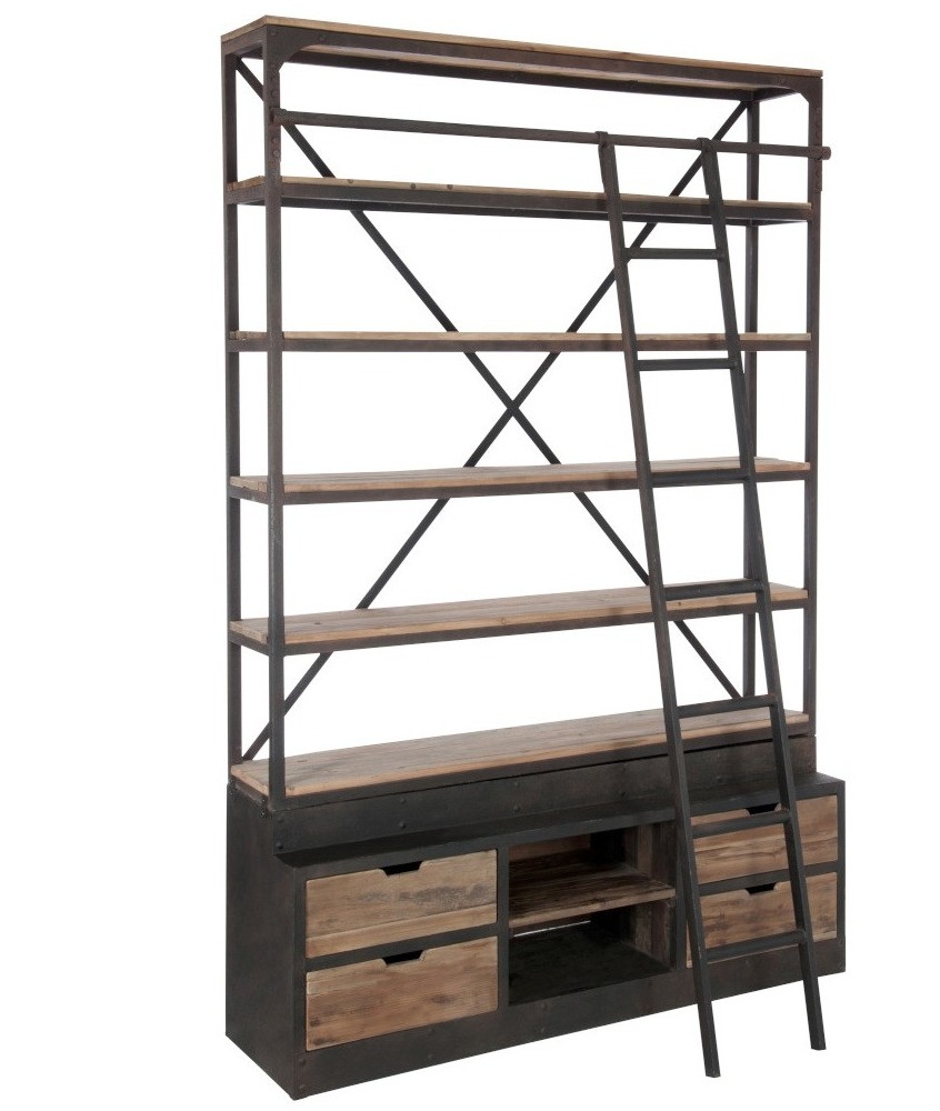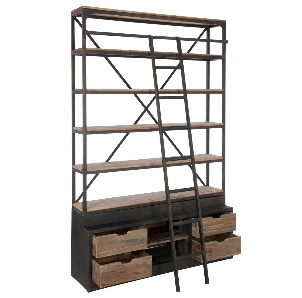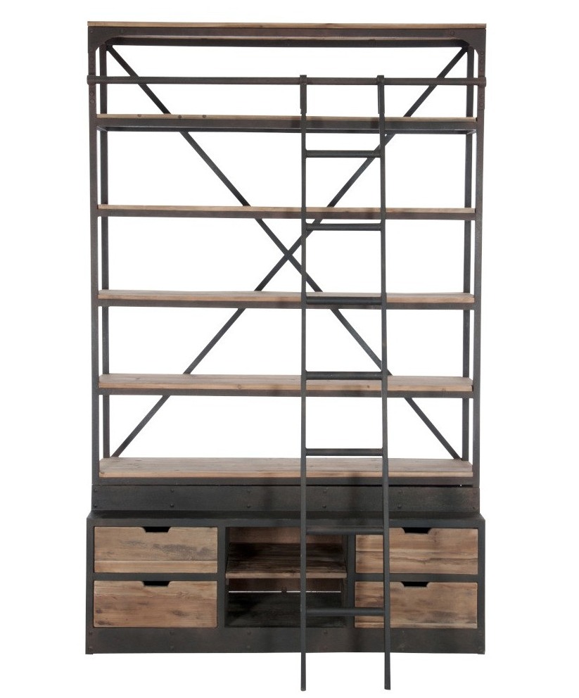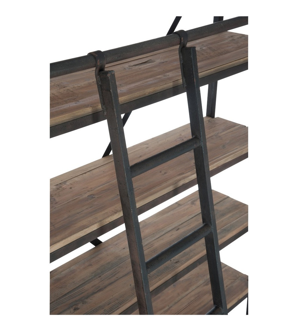Bibliothèque avec échelle bois massif foncé et métal noir Jibel
