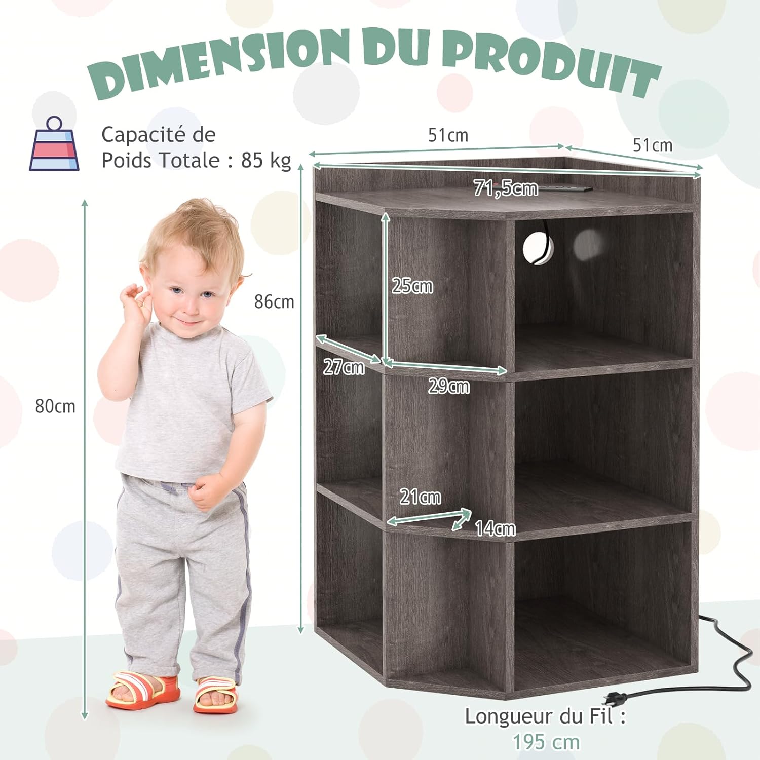 | Libellé | Bibliothèque d'angle station de charge, 4 prises, 2 usb,3 niveaux avec 9 casiers pour jouets, livres,gris |