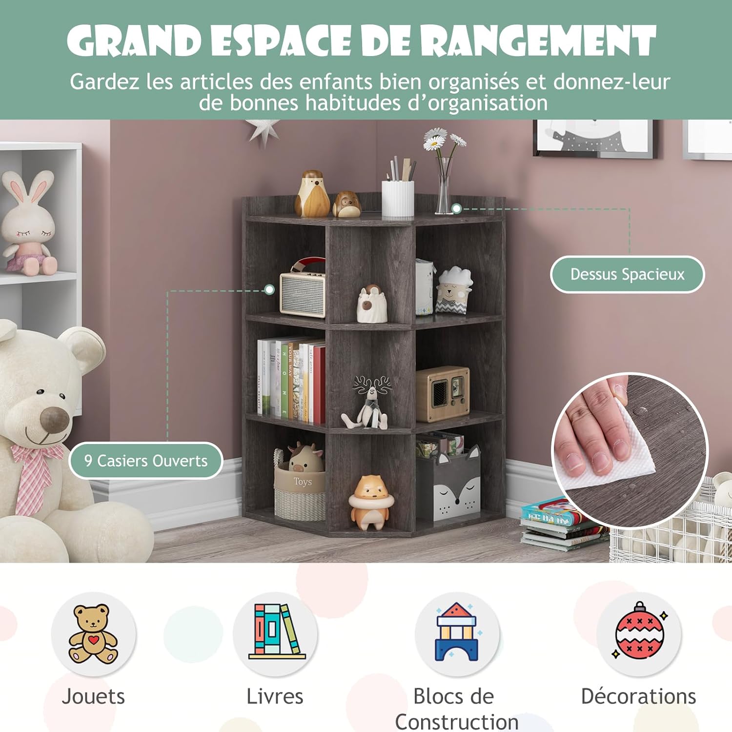 - Grand Espace de Rangement : Cet organisateur de rangement d'angle comprend un dessus spacieux et 9 compartiments ouverts, qui peuvent garder les articles des enfants bien organisés et leur donner de bonnes habitudes d'organisation. En outre, la conception supérieure clôturée empêche les objets de tomber accidentellement, garantissant ainsi la sécurité des enfants.