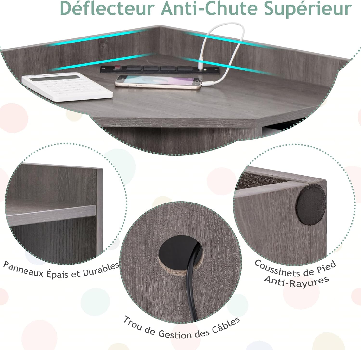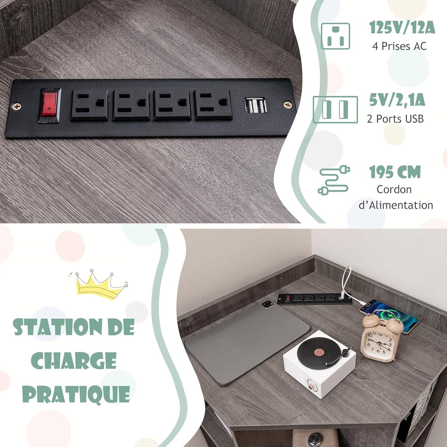 - Station de Recharge Pratique : Equipée de 2 ports USB et de 4 prises secteur, l'armoire d'angle vous permet de charger facilement plusieurs appareils, tels qu'une lampe de table, un iPad, un téléphone, un casque Bluetooth, ce qui est très pratique. Le cordon d'alimentation de 195 cm de long et le trou de gestion des câbles inclus offrent une commodité supplémentaire.