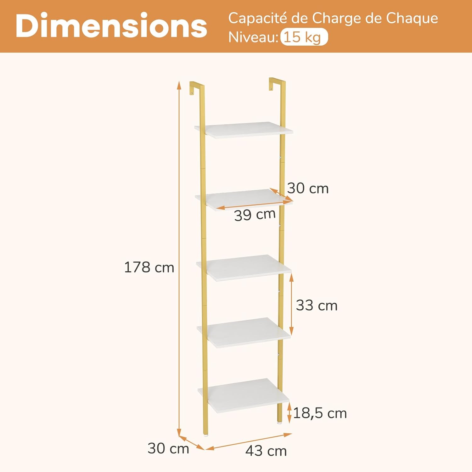 Cette étagère murale de rangement comporte 5 niveaux et utilise parfaitement l'espace vertical pour tous vos objets du quotidien. Les étagères ont un cadre métallique de haute qualité, assez robuste pour durer des années. Les dispositifs anti-basculement et les pieds réglables améliorent également considérablement la stabilité, créant ainsi un environnement sûr pour vous et votre famille. Les étagères murales sont gain de place, idéales pour les petits espaces. Avec un style attrayant et élégant, cette étagère de rangement est l'ajout parfait à votre décoration intérieure. Que ce soit comme étagère de rangement ou étagère d'exposition, elle peut valoriser votre espace de vie et améliorer votre qualité de vie.