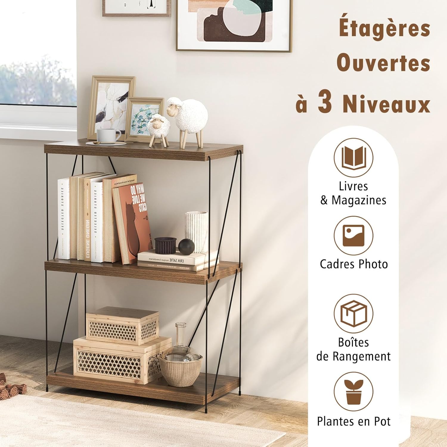 | Libellé | Bibliothèque étagère ouverte à 3 niveaux, étagère de rangement avec cadre métallique robuste,industriel |