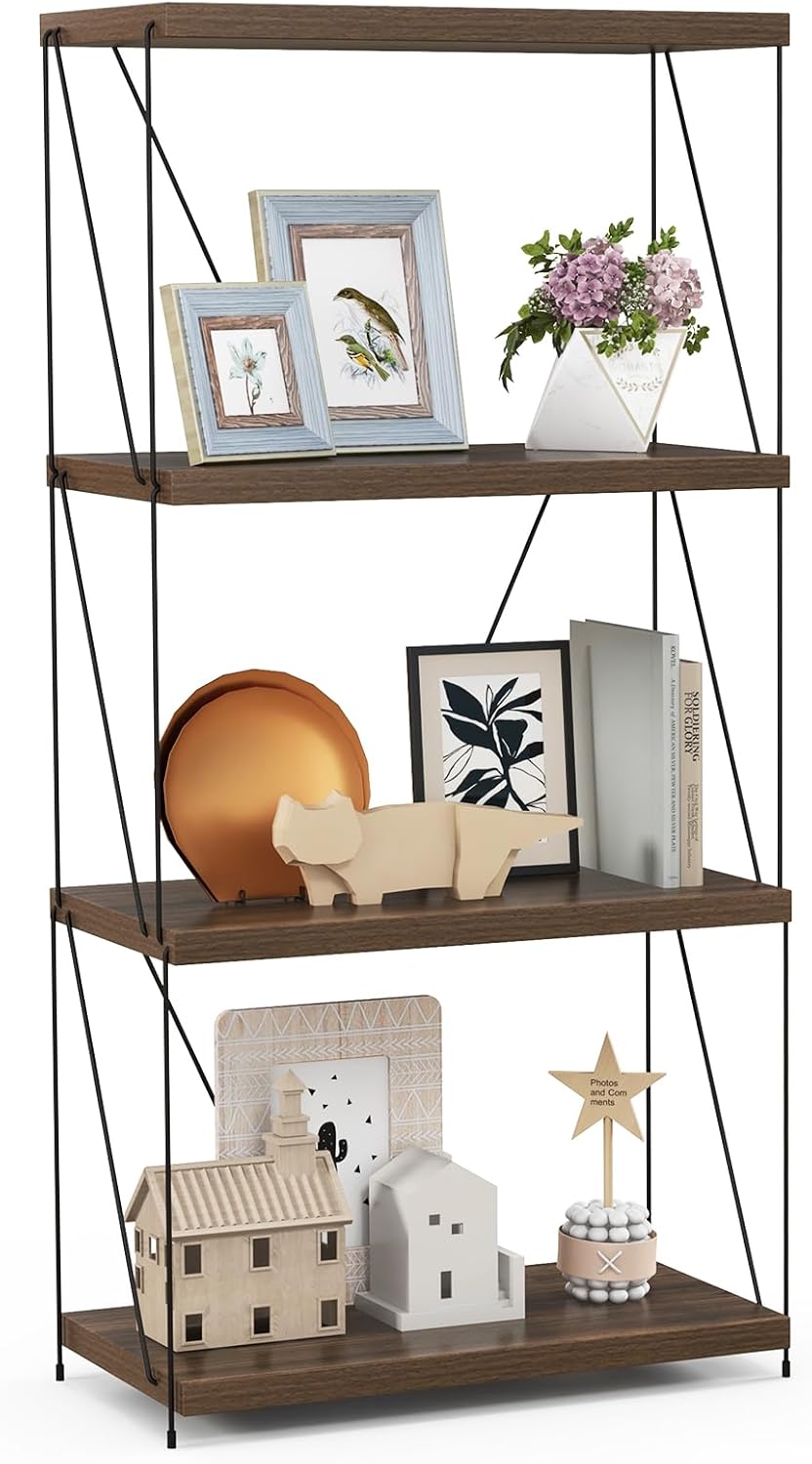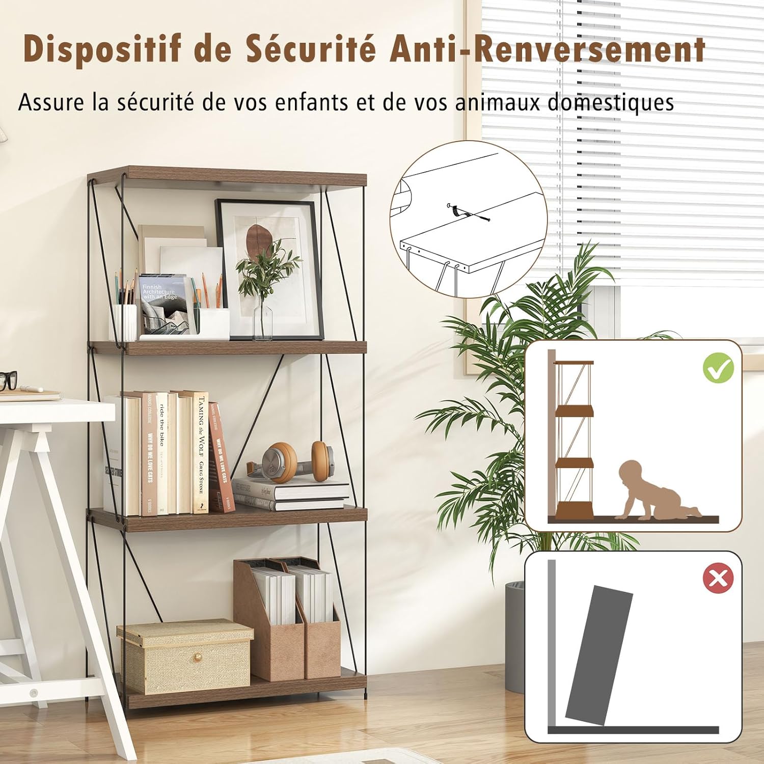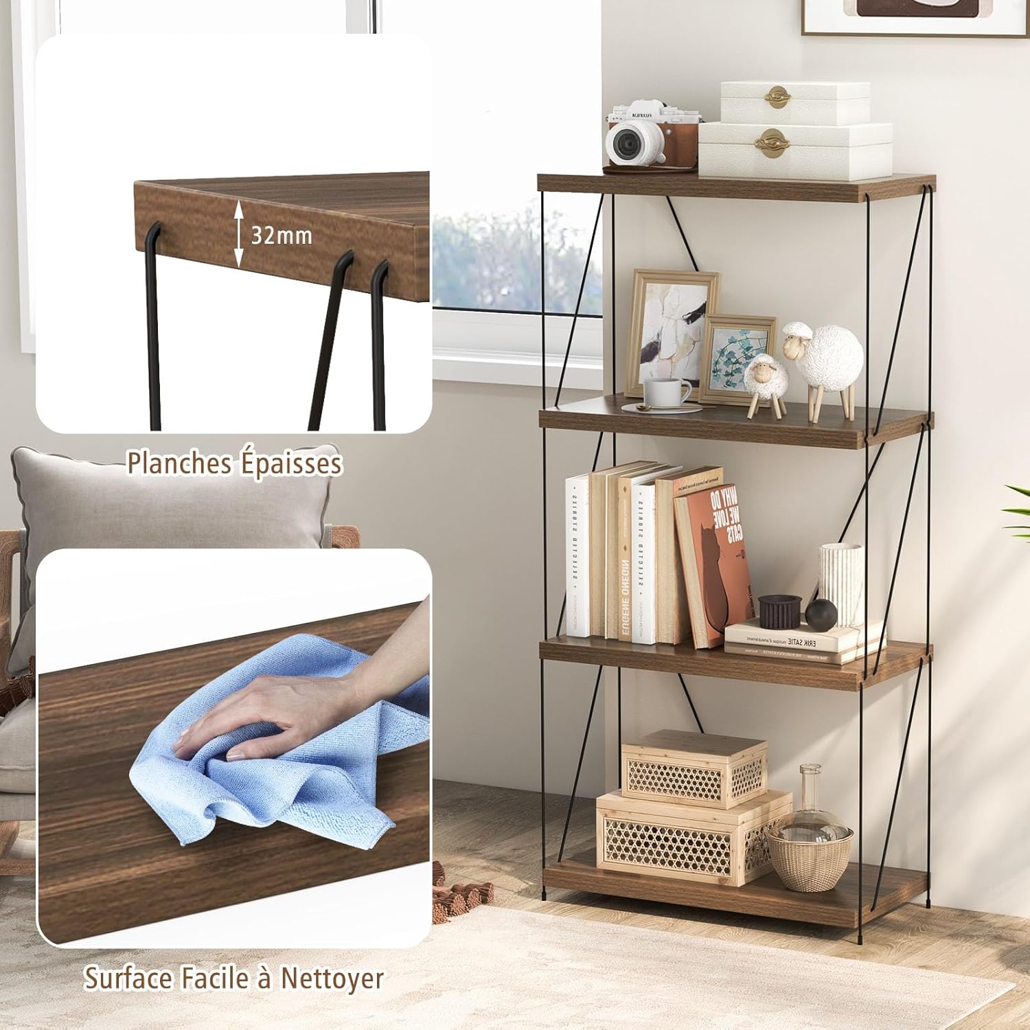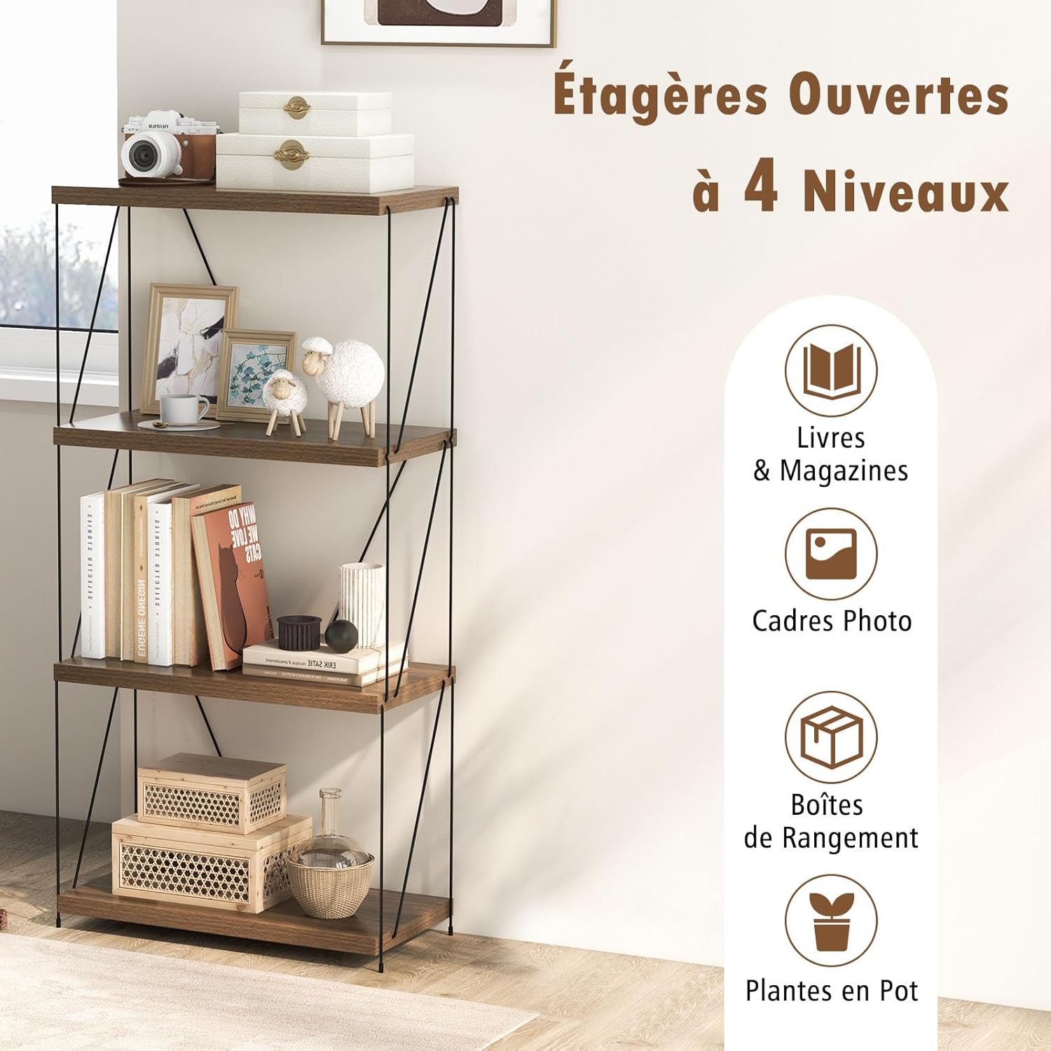 Bibliothèque étagère ouverte à 4 niveaux, étagère de rangement avec cadre métallique robuste,industriel