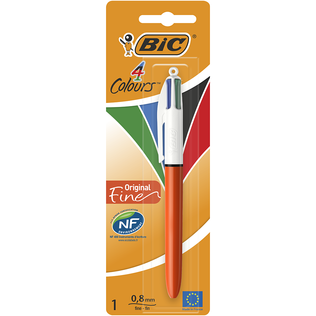 Avec la version BIC 4 Couleurs Original Fine, le célèbre stylo BIC 4 Couleurs se réinvente en version pointe fine. Bleu, noir, vert, rouge: 4 couleurs sans changer de stylo pour prendre des notes, organiser son travail, corriger, dessiner. Stylo-Bille Rétractable Pointe Fine (0,8 mm) - Blister de 1