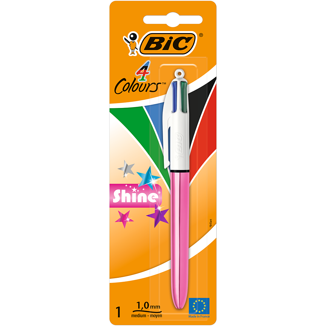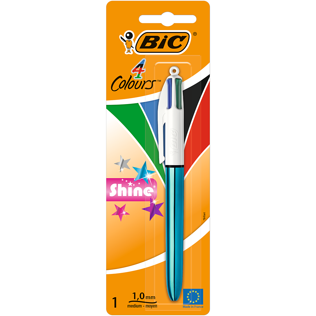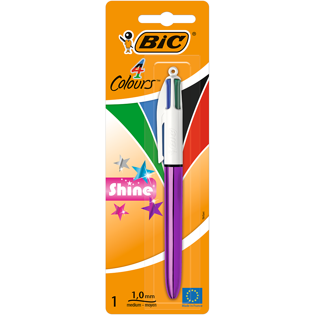 Le stylo BIC 4 Couleurs Shine se pare d'un revêtement brillant, moderne et métallique : argent, bleu, rose ou violet (aléatoire). Il a 4 pointes moyennes de 1,0 mm (bleu, noir, rouge, vert) convenant à tout type d'usage : écrire, dessiner, organiser ses notes ou créer un "bullet journal". Grâce à son bouton poussoir, changez de couleur en un clic sans jamais changer de stylo.