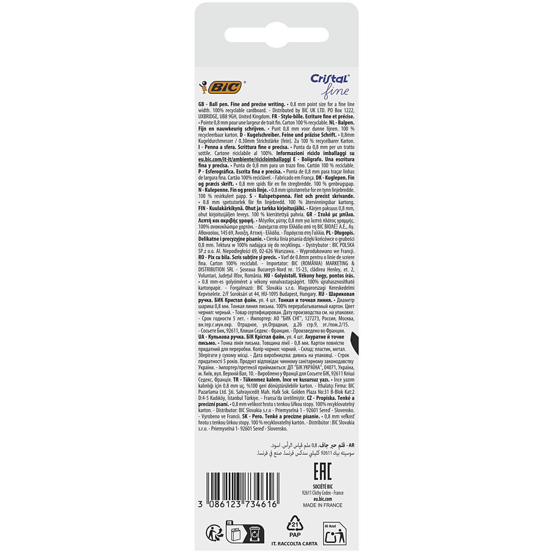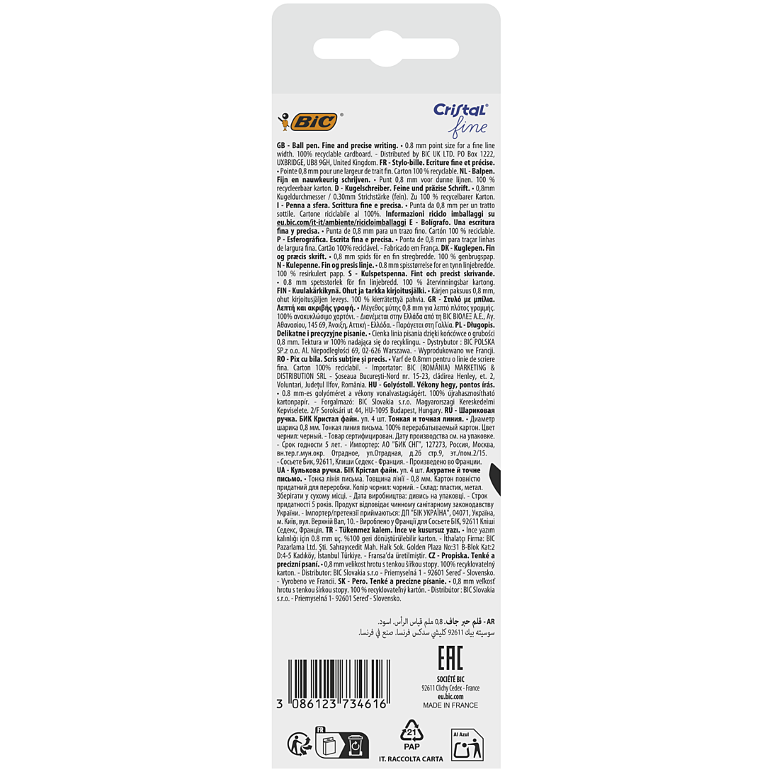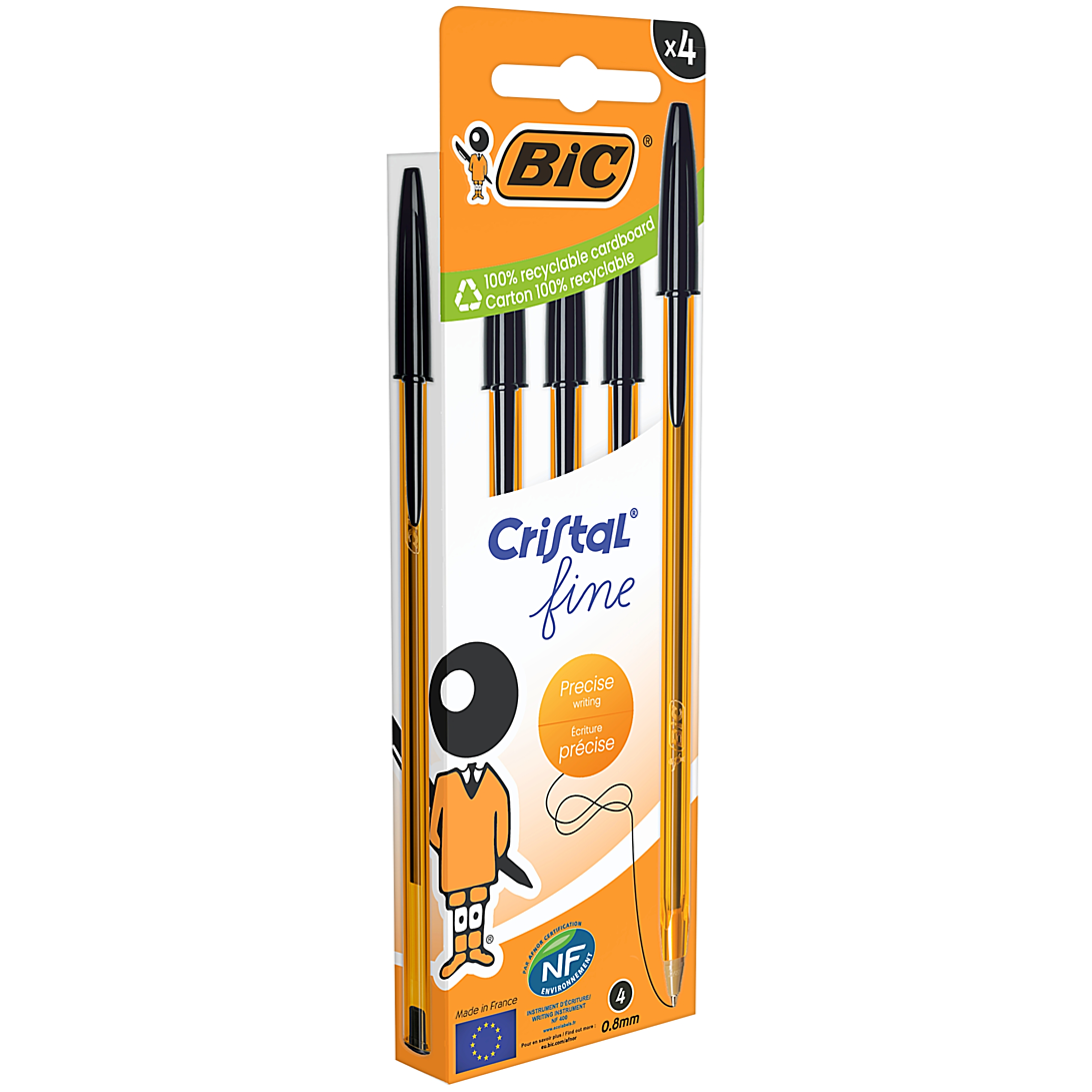 BIC a doté les 4 stylos-bille noirs BIC Cristal Original Fine de ce lot d'une pointe fine pour tous ceux à la recherche d’une précision ultime. À l’instar de son grand frère, le stylo BIC Cristal Original, ce stylo présente le même trio à la pointe de la technologie : une pointe, une bille sphérique et une encre de qualité conçue dans les usines BIC. Ce système garantit un débit d’encre régulier pour une écriture fine et précise ainsi que des dessins détaillés. Depuis sa création, BIC améliore constamment le stylo-bille Cristal Original Fine. Au fil du temps, il est devenu plus léger et l’encre à séchage instantané conçue dans ses usines est perfectionnée pour écrire avec une sensation plus douce. BIC fabrique ce stylo dans ses usines en Europe suivant son savoir-faire exclusif qui a traversé les décennies. Et parce que BIC se sent concerné, son emballage est conçu en carton 100 % revalorisable. BIC fait les choses à la perfection.