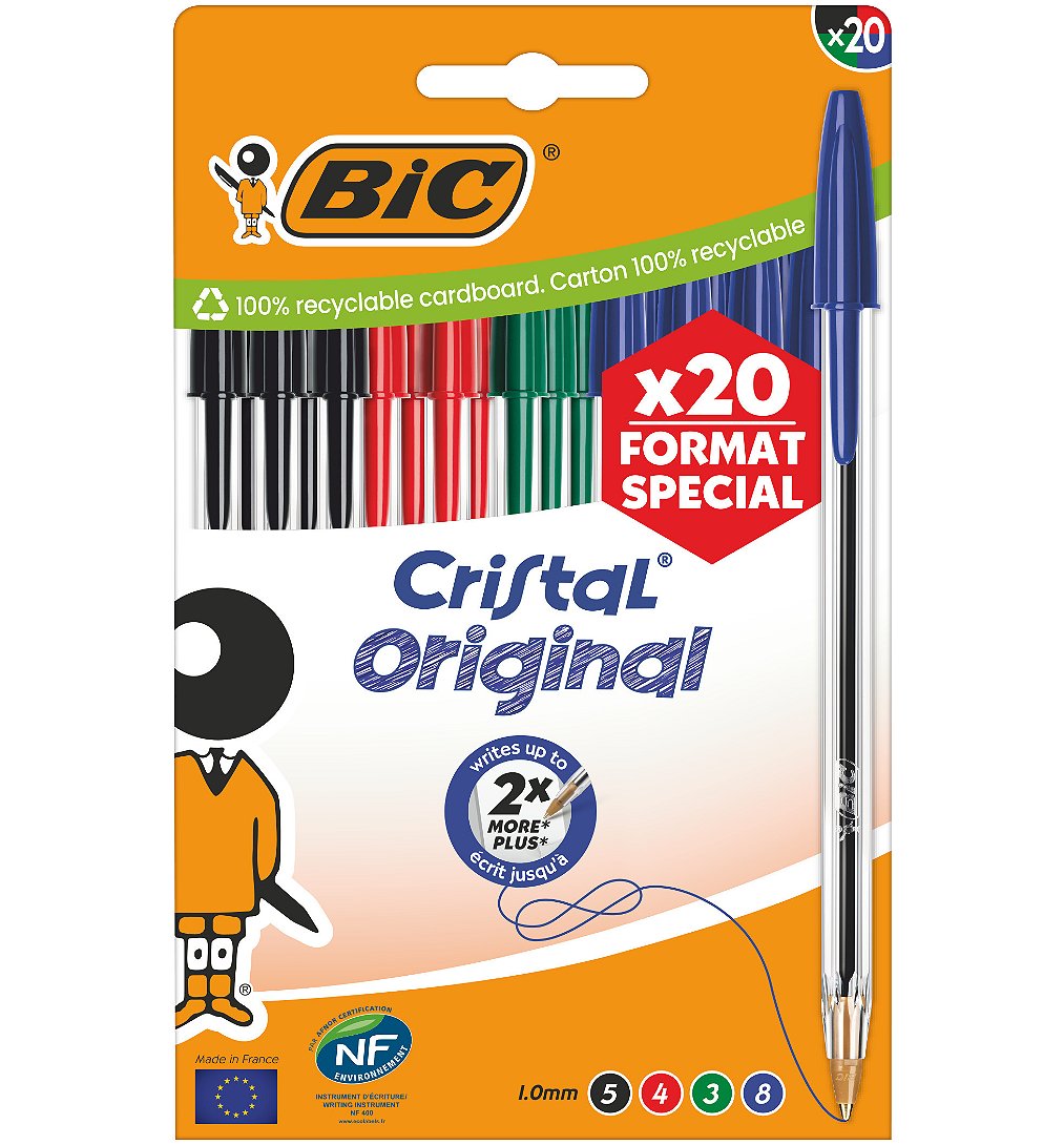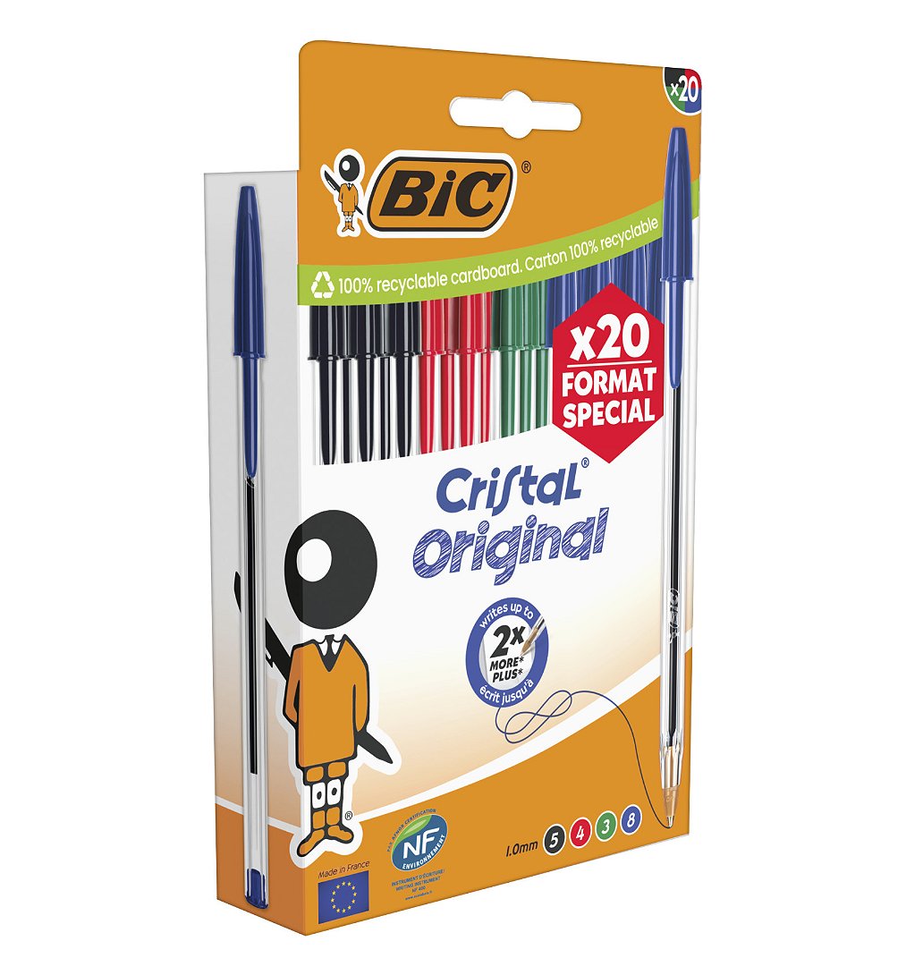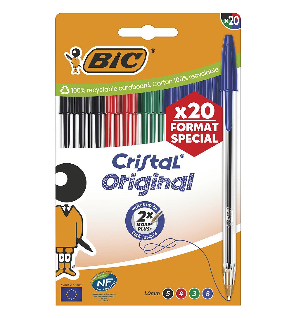 | Libellé | BIC Cristal Original Stylos-Bille Pointe Moyenne (1,0 mm) avec Capuchons et Embouts Assortis - Couleurs Assorties, Pochette Format Spécial de 20 |